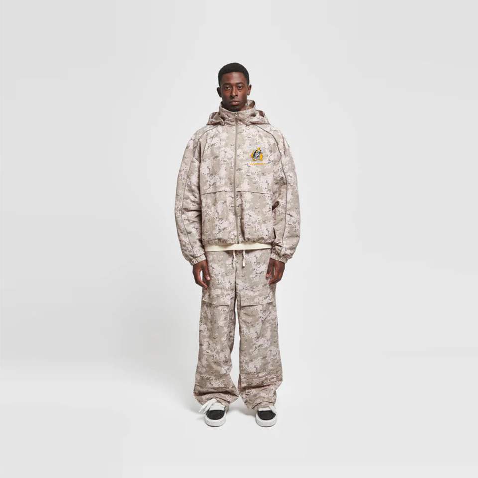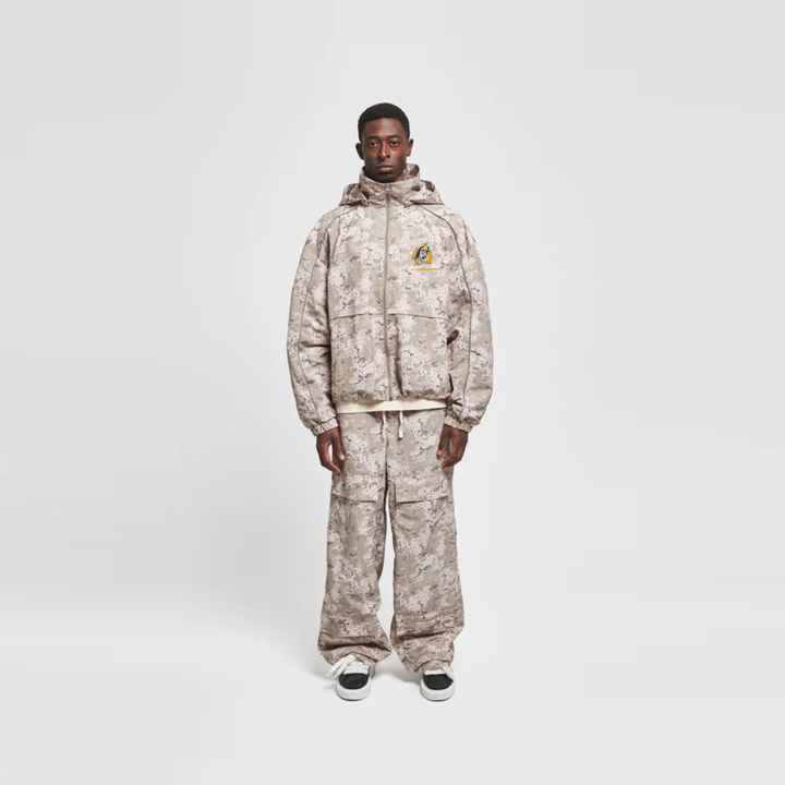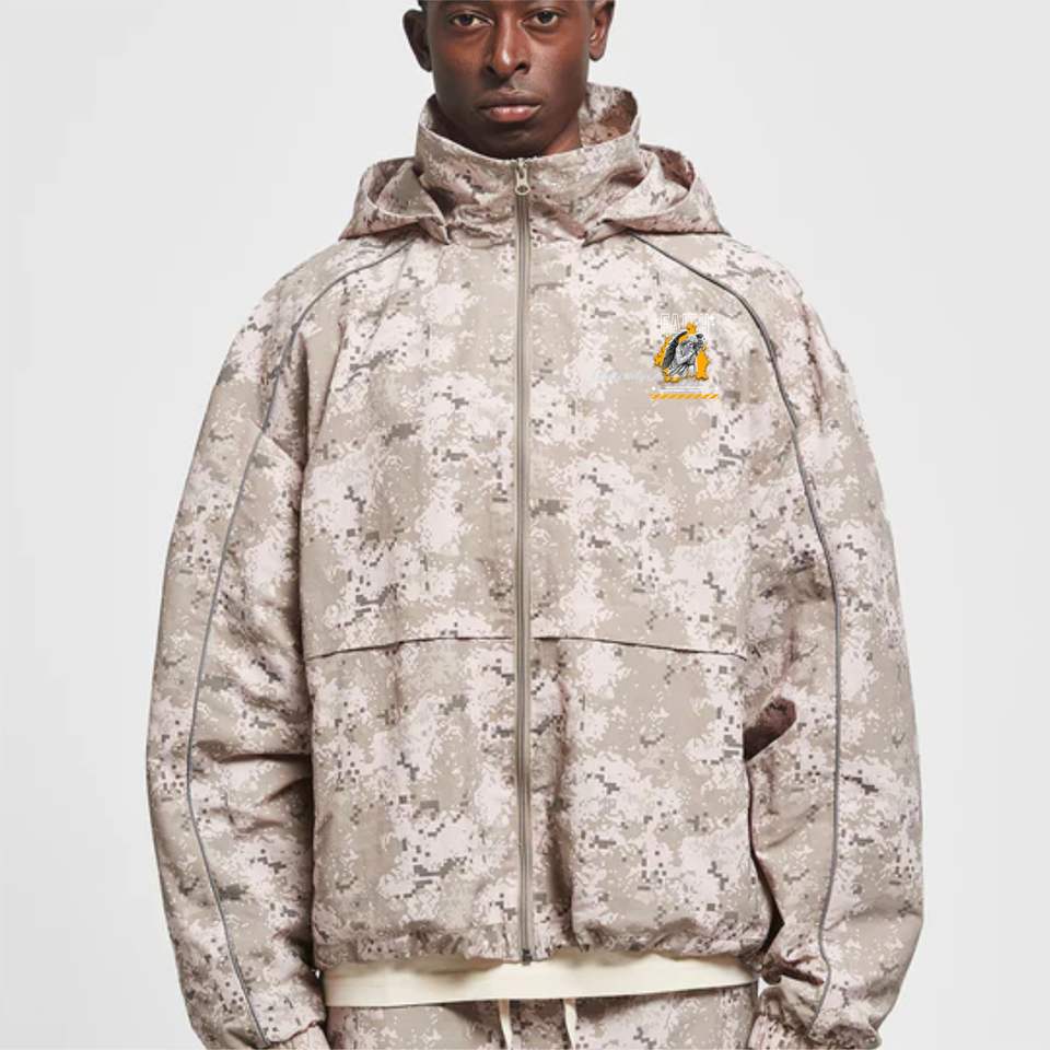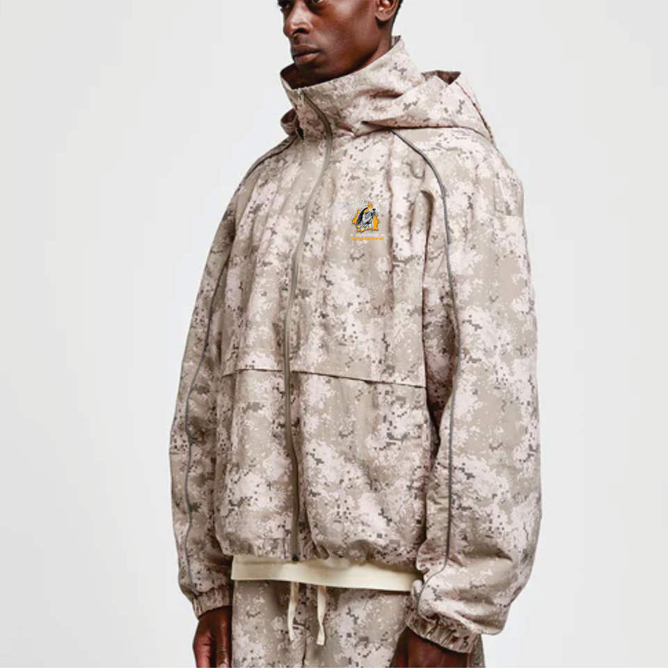 เสื้อกันฝนลายพรางกันน้ำและกันลมพร้อมชายเสื้อฮู้ดที่ถอดออกได้และทรงครอปพอดี