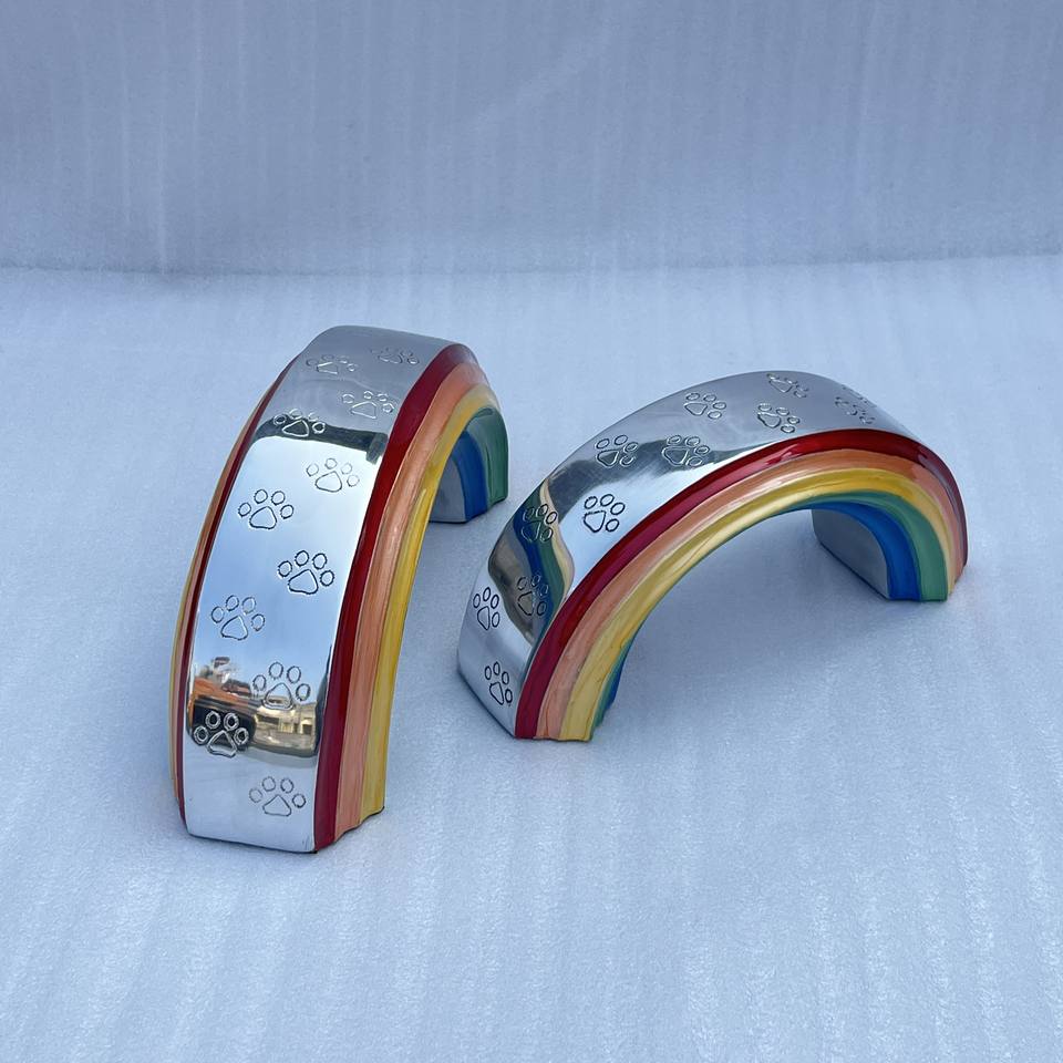 โกศใส่เถ้าสัตว์เลี้ยงขนาด 12 นิ้ว รุ่นเรนโบว์บริดจ์ ดีไซน์ทันสมัย ทำจากอะลูมิเนียม สลักลายอุ้งเท้า สำหรับเก็บเถ้าสัตว์เลี้ยง โกศสัตว์เลี้ยงที่มีสไตล์