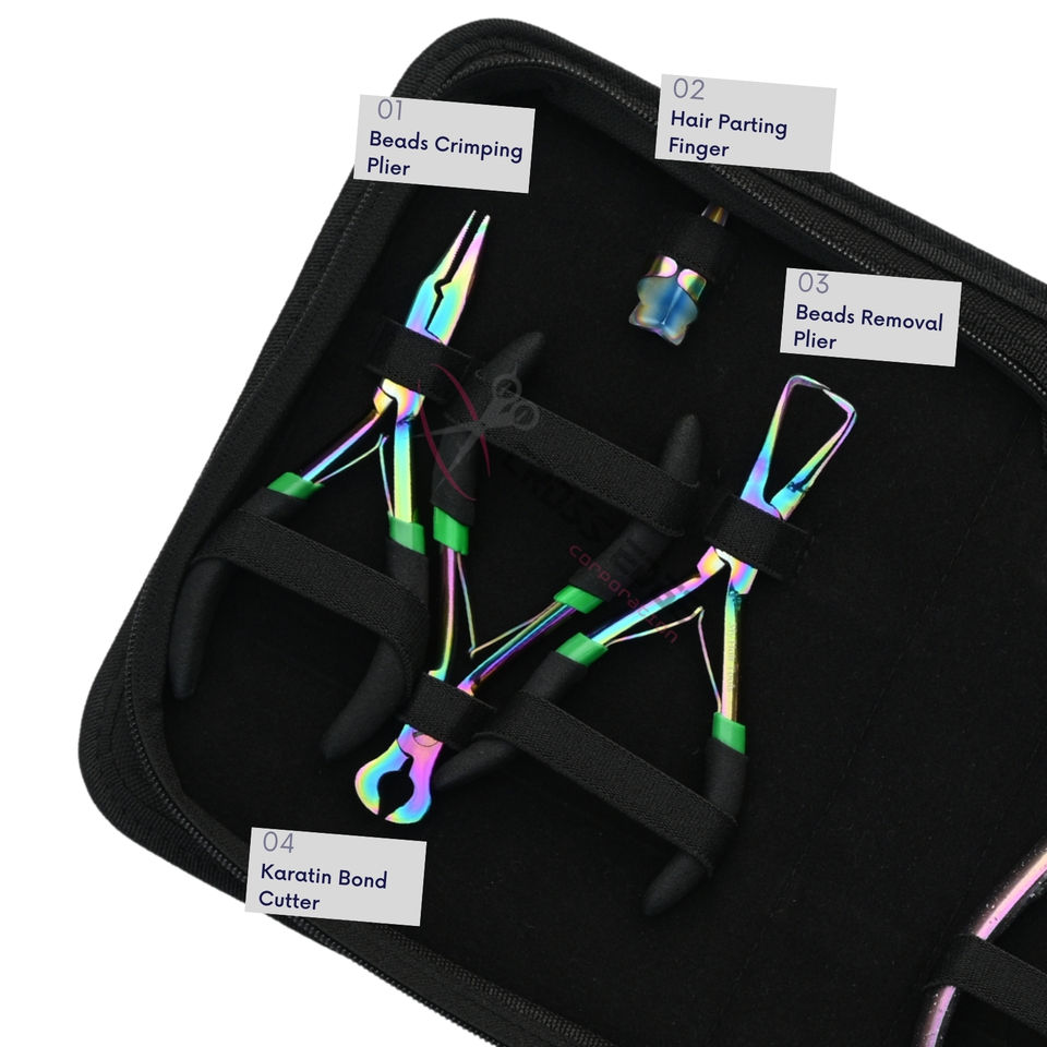 คีมต่อผมเทปอินแบบปรับแต่งสีได้ พร้อมเครื่องมือตัดเคราตินและที่จับนิ้ว