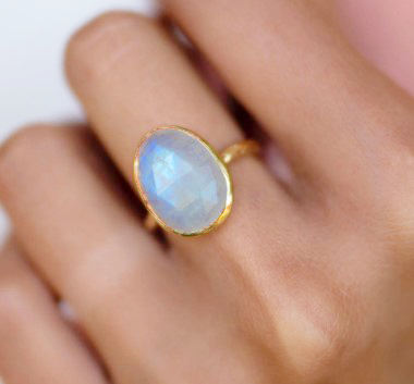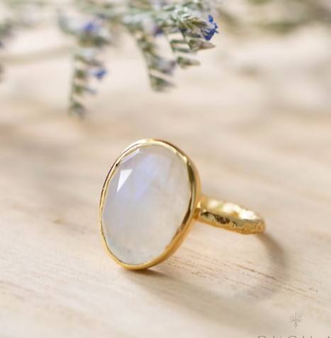 แหวนพลอยมูนสโตนสีรุ้งทรงรีเงินแท้ชุบทองคำขาวและโรสโกลด์ลายตอกแบบคอลเลตต์ แหวนพลอยประจำเดือนเกิด