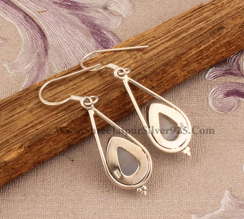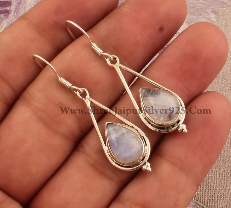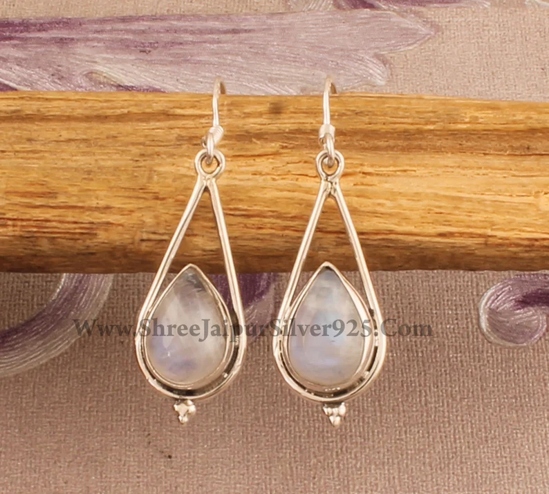 เรนโบว์มูนสโตนลูกแพร์หินแข็ง925เงินสเตอร์ลิงแฮนด์เมดต่างหูเงิน Boho สำหรับวันครบรอบแต่งงาน