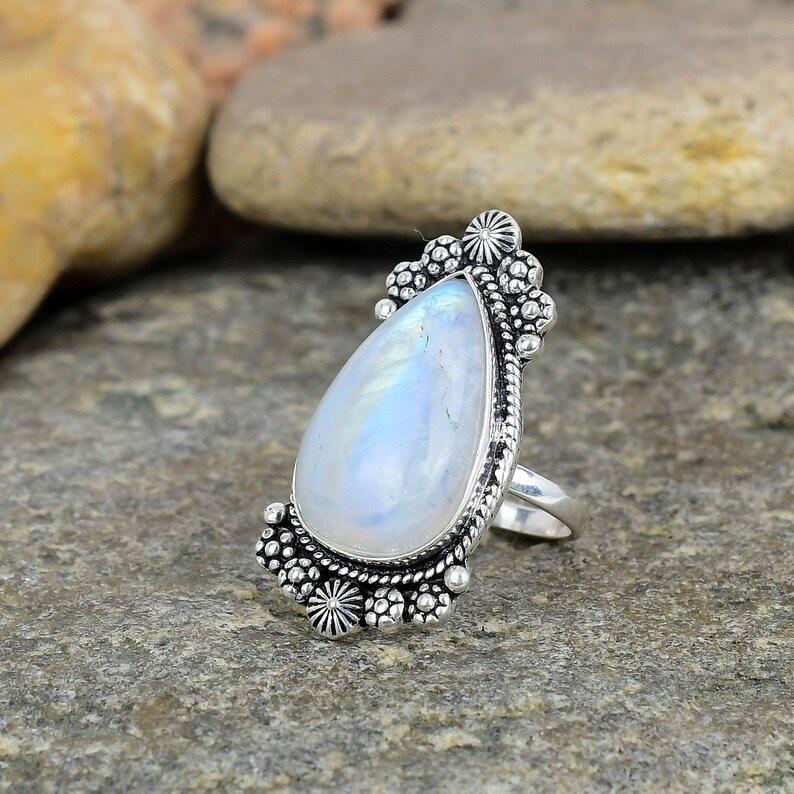 แหวนพลอยมูนสโตนสีรุ้ง925พลอยธรรมชาติสไตล์โบฮีเมียนแบบมินิมอลลิสต์ขนาดพิเศษของขวัญที่สมบูรณ์แบบสำหรับผู้หญิง