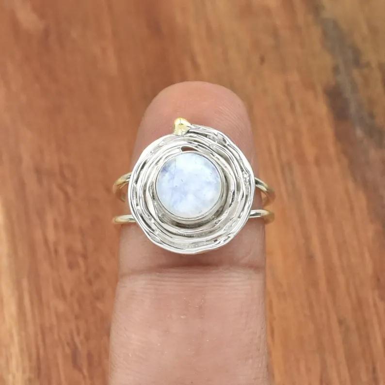 แหวนพลอยมูนสโตนสีรุ้ง925แหวนเงินคู่ของขวัญสำหรับผู้หญิง