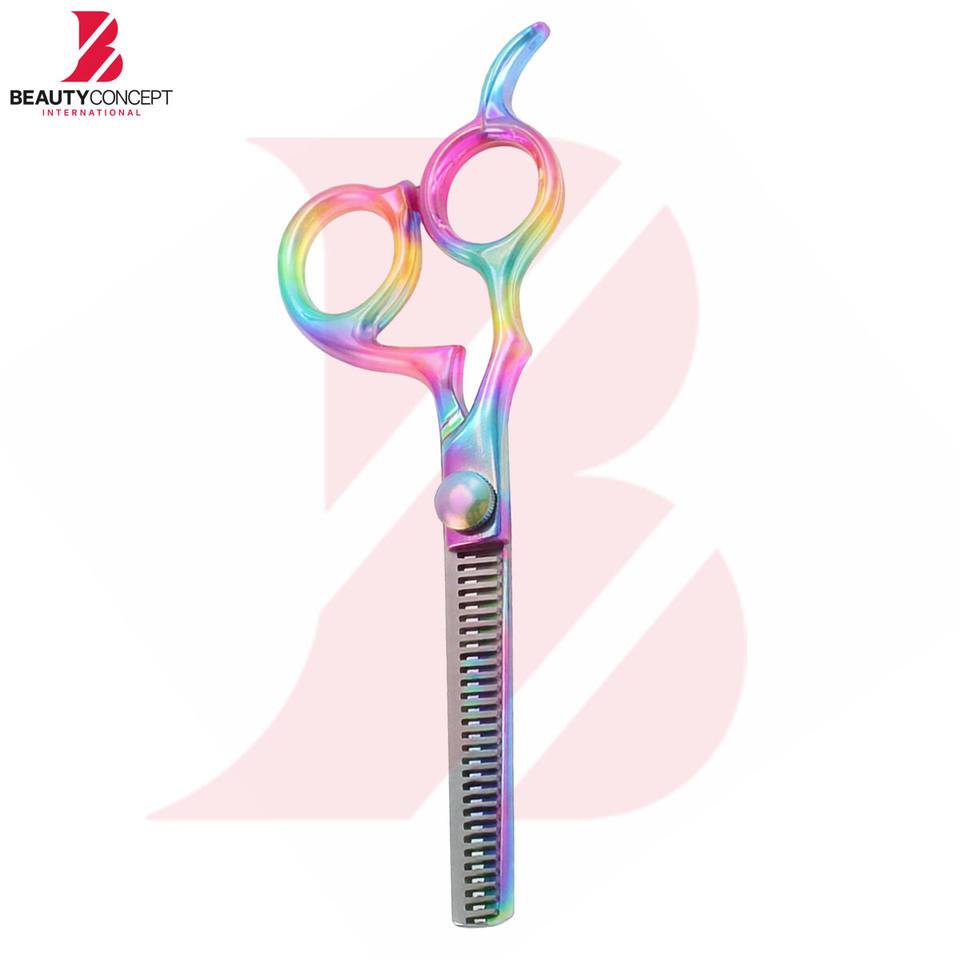 กรรไกรซอยผมเคลือบไทเทเนียมหลากสีรุ้ง พร้อมด้ามจับพลาสติกตามหลักสรีรศาสตร์ สำหรับช่างทำผมมืออาชีพ