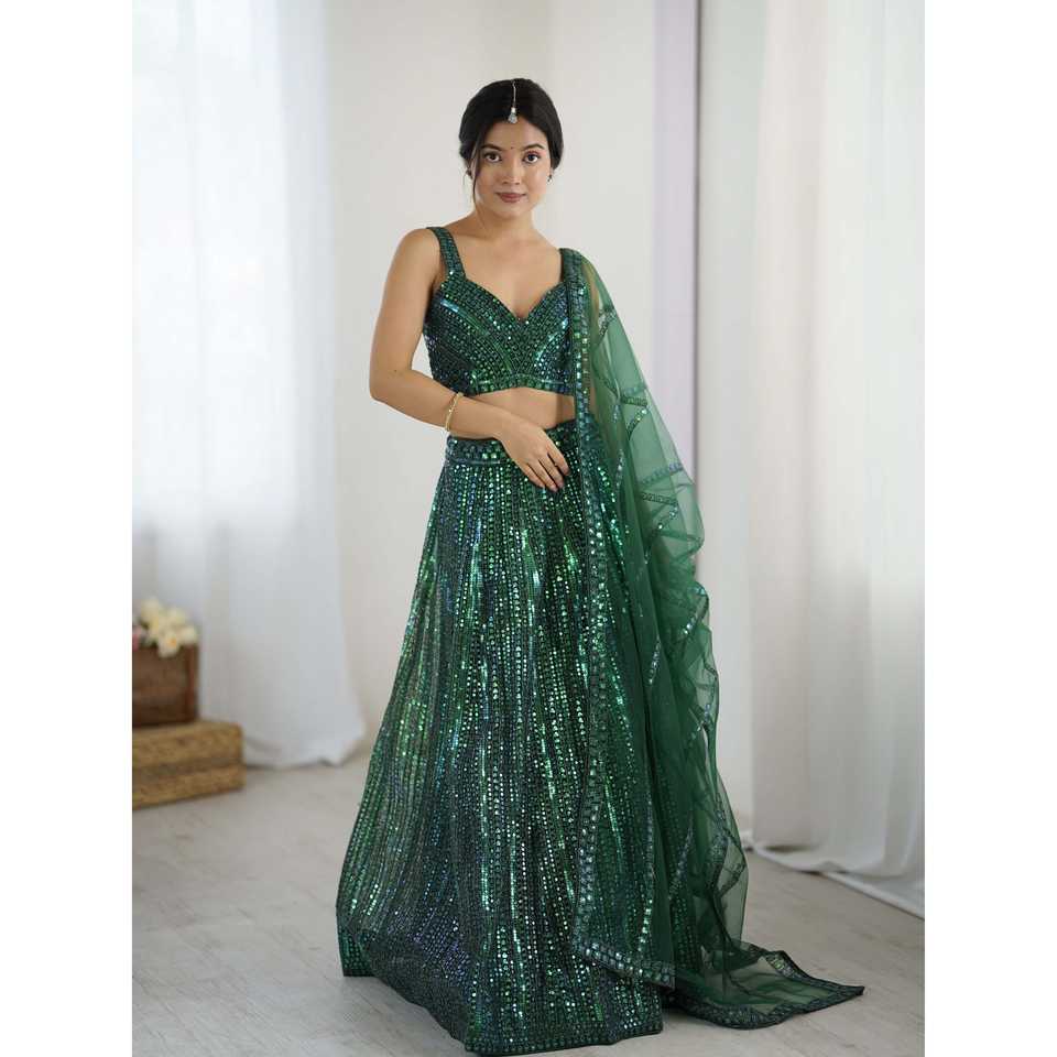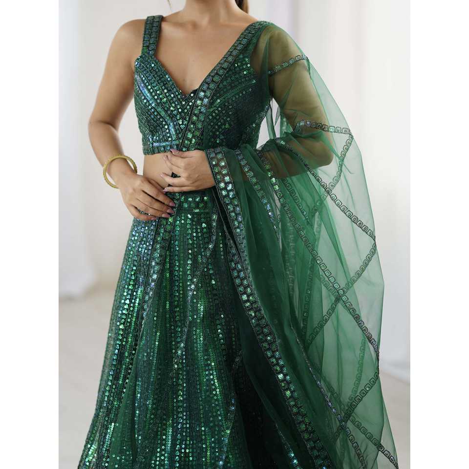 ชุดเลเฮนกาโชลีทรงเอไลน์ประดับเลื่อมสีรุ้ง พร้อมงานปักดิ้นดอริ เสื้อครอปท็อปเอวธรรมชาติ เหมาะสำหรับงานปาร์ตี้