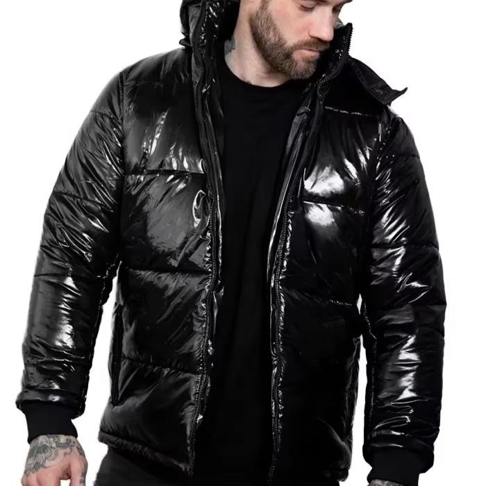 เสื้อแจ็คเก็ตบุขนเป็ดหนาสำหรับผู้ชาย Rainbow Spray แบบมีฮู้ด ขายส่ง MOQ ต่ำ เสื้อกันลมและกันน้ำแบบเรียบเงาสำหรับฤดูหนาว