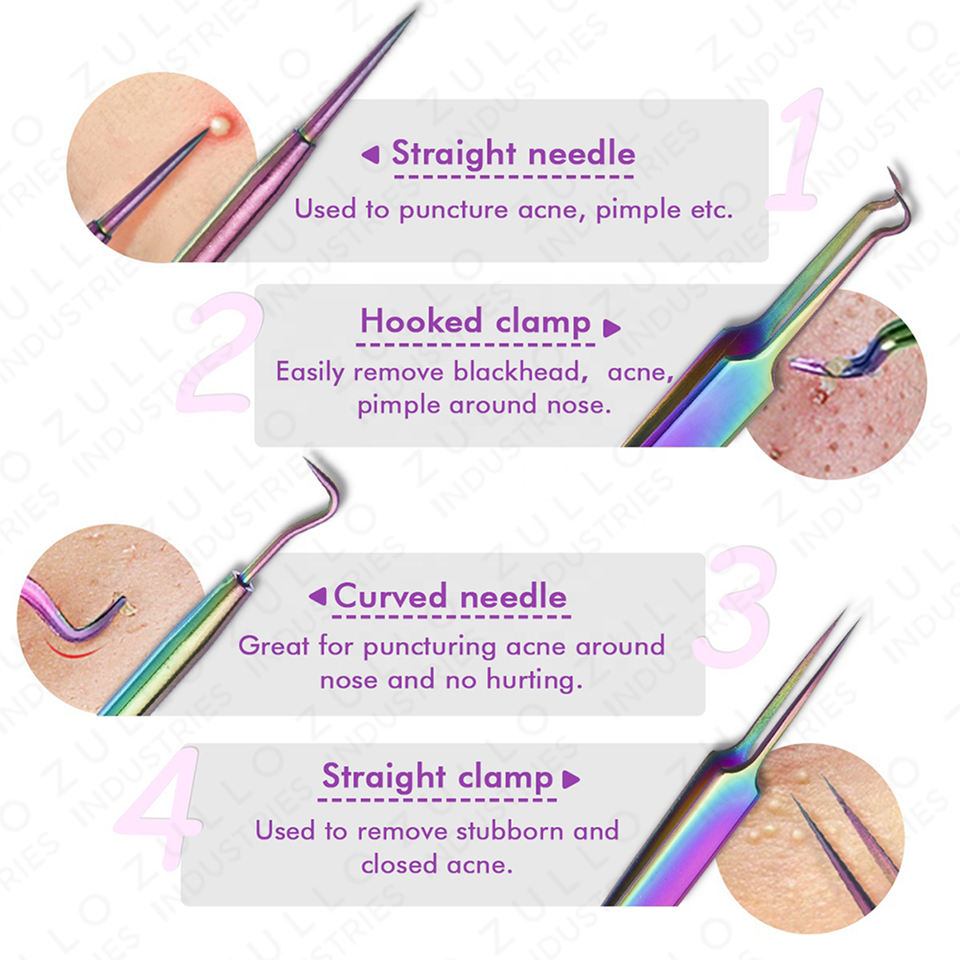 ชุดอุปกรณ์กำจัดสิวเสี้ยนสแตนเลสสีรุ้ง พร้อมเข็มกดสิว แหนบกำจัดสิวหัวขาว ดูแลผิวหน้า ราคาขายส่ง
