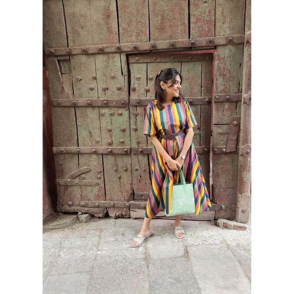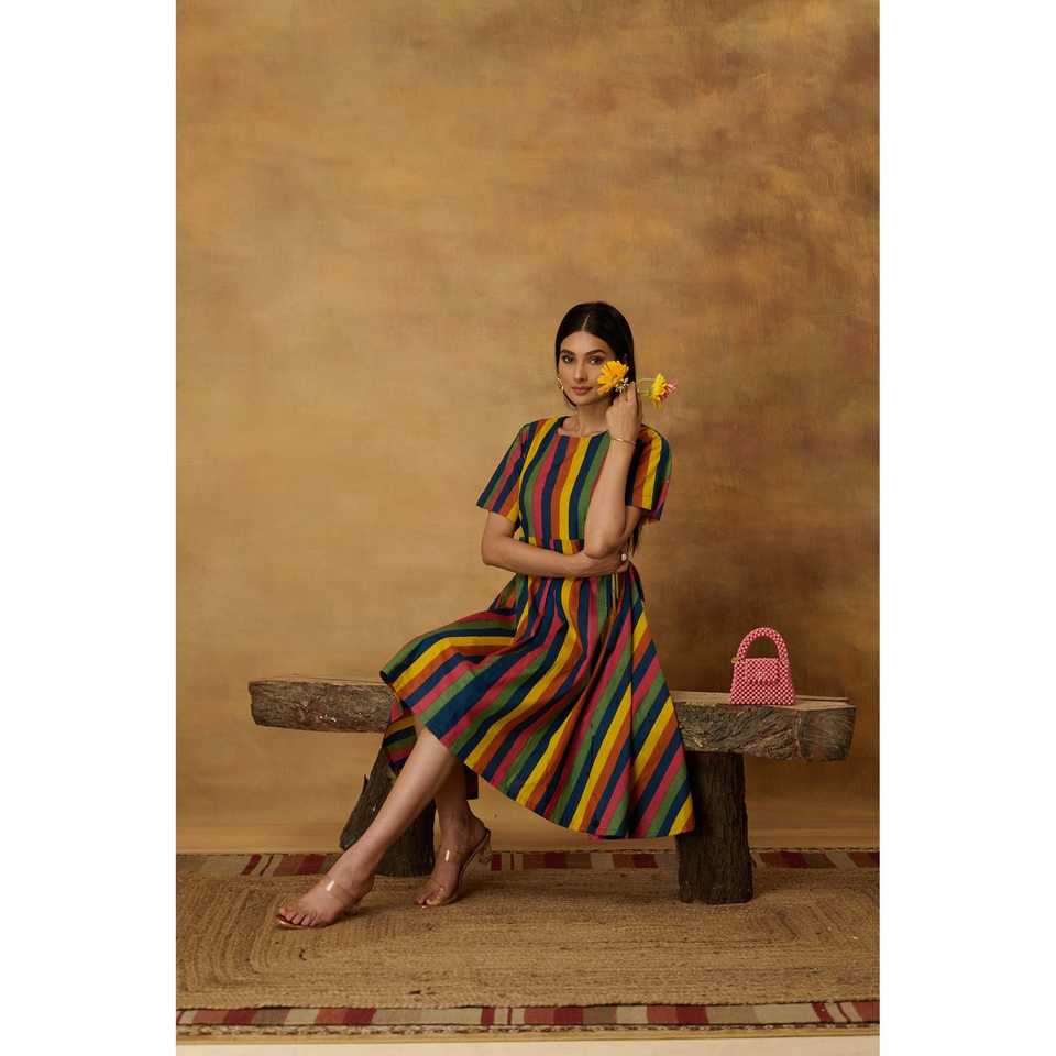Rainbow Stripes Fit n Flare ODM Dress 100% Cotton Plus-Size Formal Ruffles Ruched Spaghetti Straps S-XXL 40-inch Loop Closure