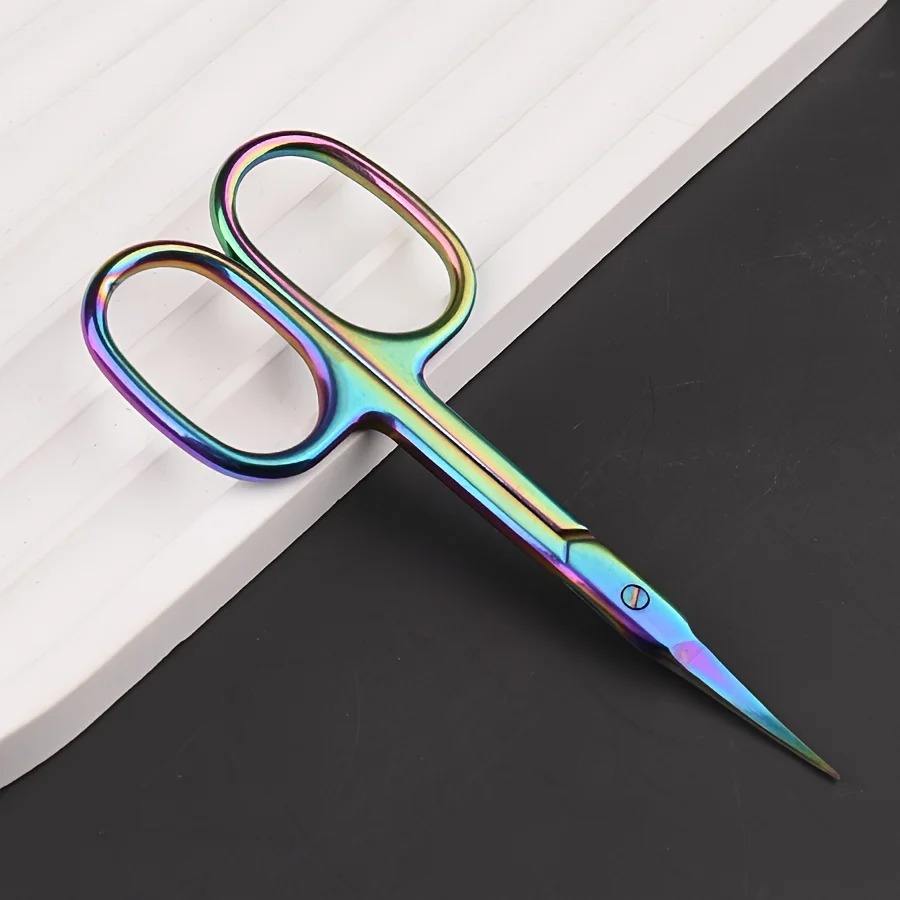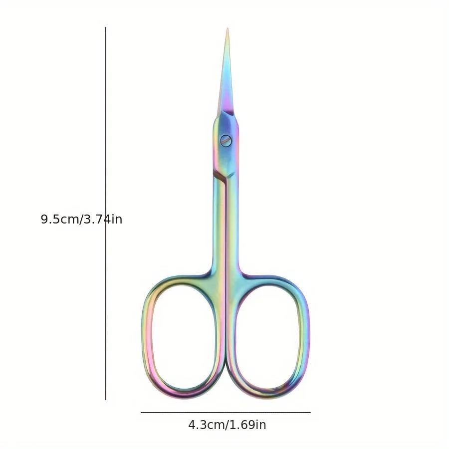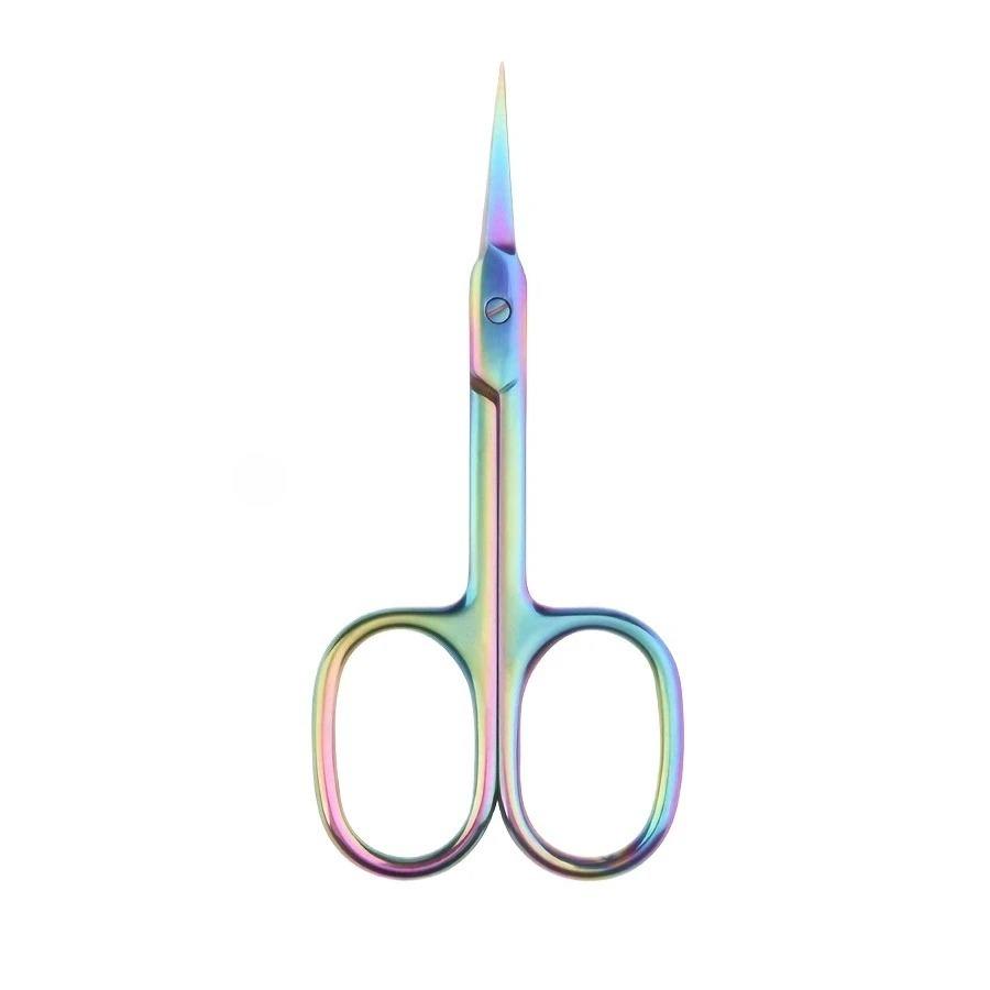 กรรไกรตัดหนังกำพร้าเคลือบไทเทเนียมสีรุ้ง พร้อมใบมีดโค้งละเอียด ผลิตจากเหล็กกล้าไร้สนิมระดับมืออาชีพ สำหรับการตัดแต่งคิ้วอย่างแม่นยำ