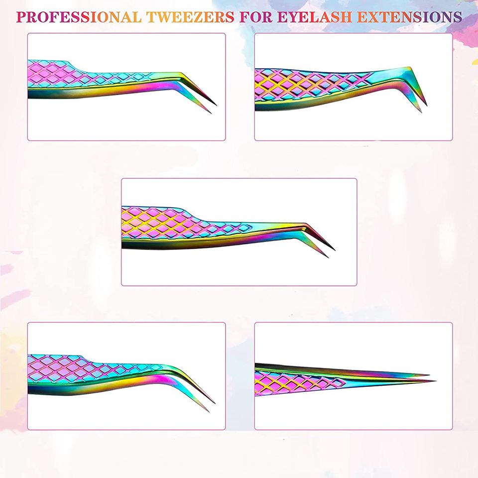 ชุดแหนบขนตาปลอมแบบปลายโค้งตรง5ชิ้นแหนบเคลือบไทเทเนียมที่ดีที่สุดสีรุ้ง