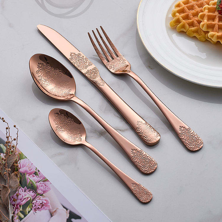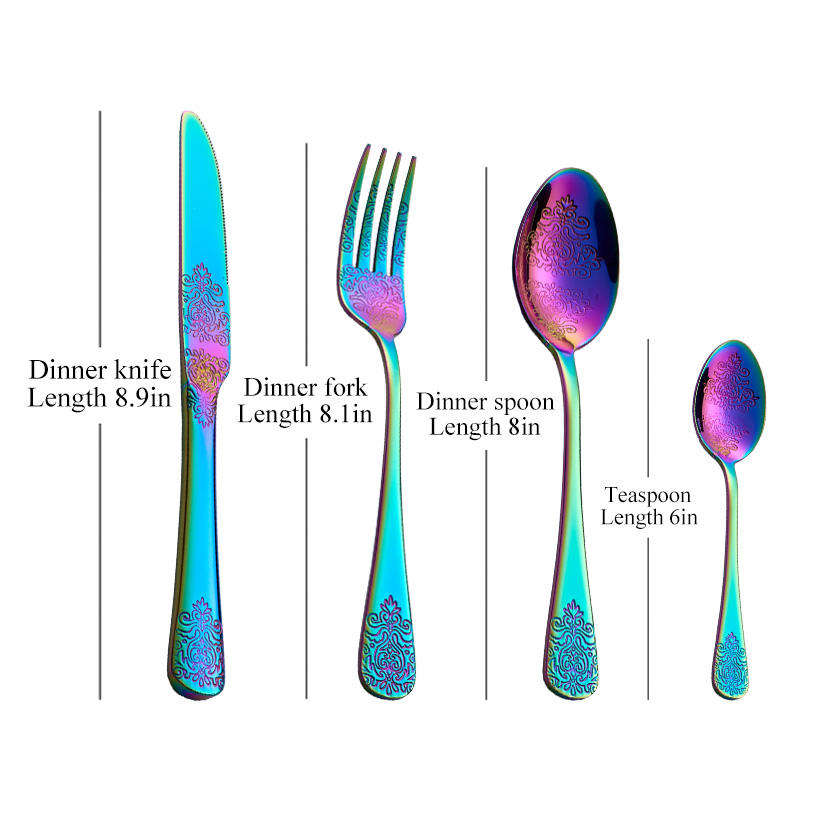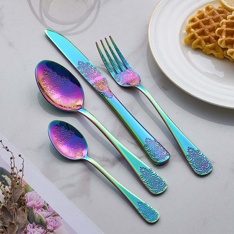 ชุดช้อนส้อมสีรุ้งที่มีชั้นสีสันสดใสที่ทำจากเหล็กที่แข็งแกร่งเพิ่มความรู้สึกร่าเริงให้กับการตกแต่งโต๊ะที่ทันสมัย