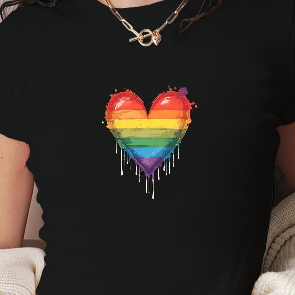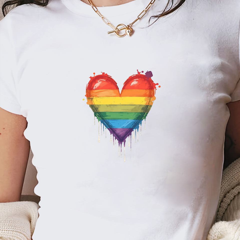 เสื้อยืดแฟชั่นผู้หญิงทรงเข้ารูป Y2K ลายหัวใจสีรุ้งและลายสาดสี ผ้าถัก