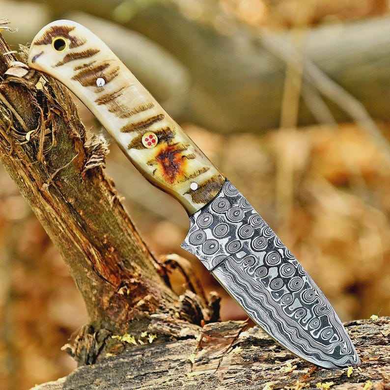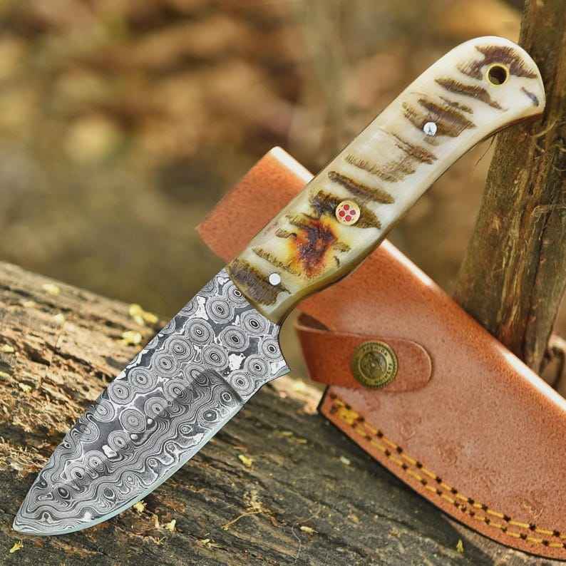 มีดล่าสัตว์แบบเต็มด้าม ลายหยดน้ำ ด้ามทำจากเขาสัตว์แท้ ผลิตตามสั่ง (OEM) ใบมีดเหล็กดามัสกัสทำมือ สำหรับการล่าสัตว์และเอาตัวรอด