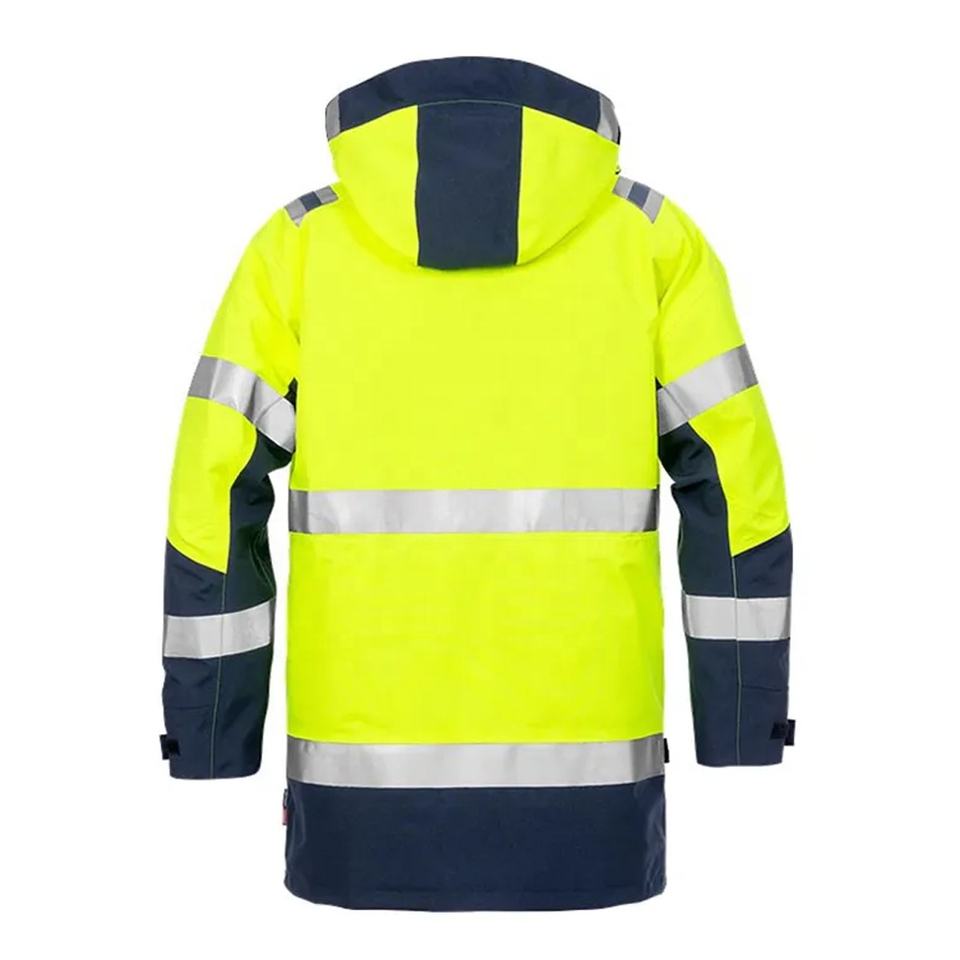 เสื้อแจ็คเก็ตทำงานนิรภัยสีเหลืองสะท้อนแสงกันฝน ระดับอุตสาหกรรม 2 สำหรับฤดูหนาว กันหิมะ ผลิตจากโพลีเอสเตอร์