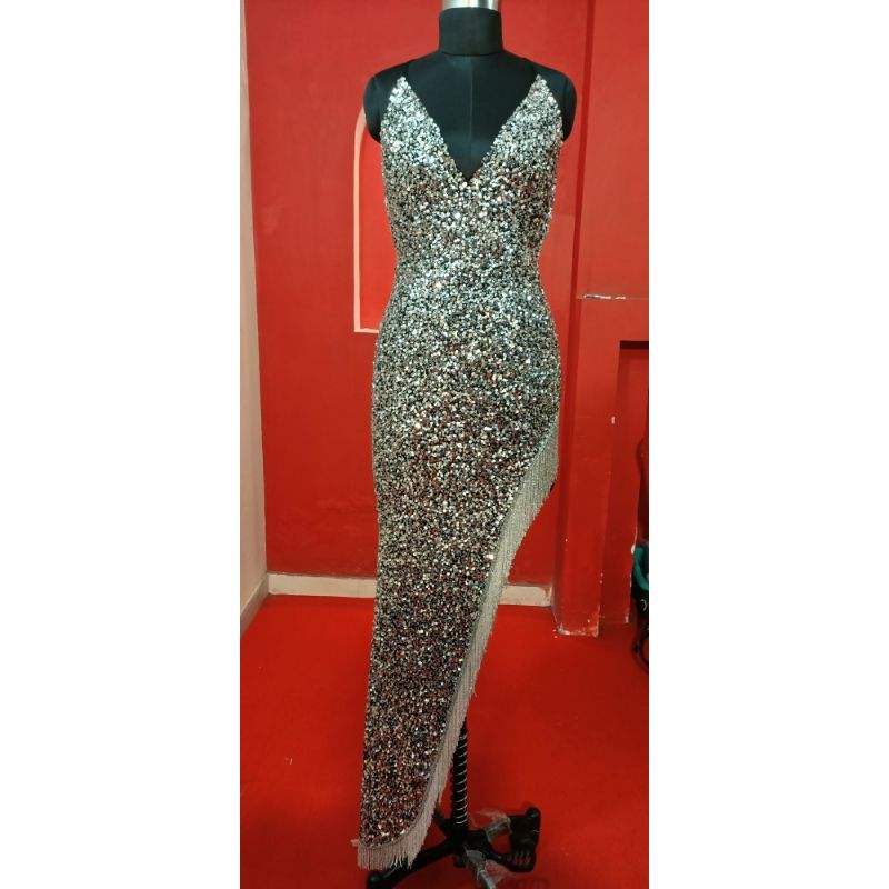 ชุดราตรีคอวีติดลูกปัดหรูหราสำหรับผู้หญิงชุดเดรสแขนยาวแขนกุดผ่าข้างไม่เหมือนใครสำหรับงานพรอม