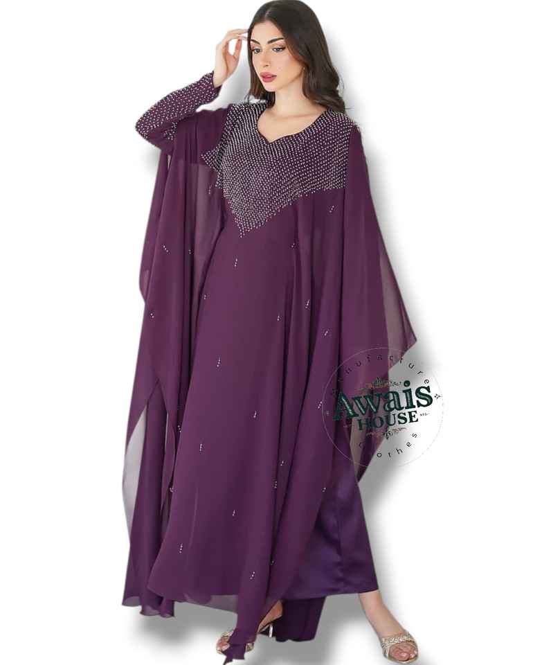 ชุดราตรีแบบมุสลิมสำหรับรอมฎอนและอีด แบบเรียบง่าย ผ้าชีฟอง ประดับลูกปัด คอวี ทรงเอ ยาวกรอมพื้น ไซส์ใหญ่สำหรับผู้หญิง