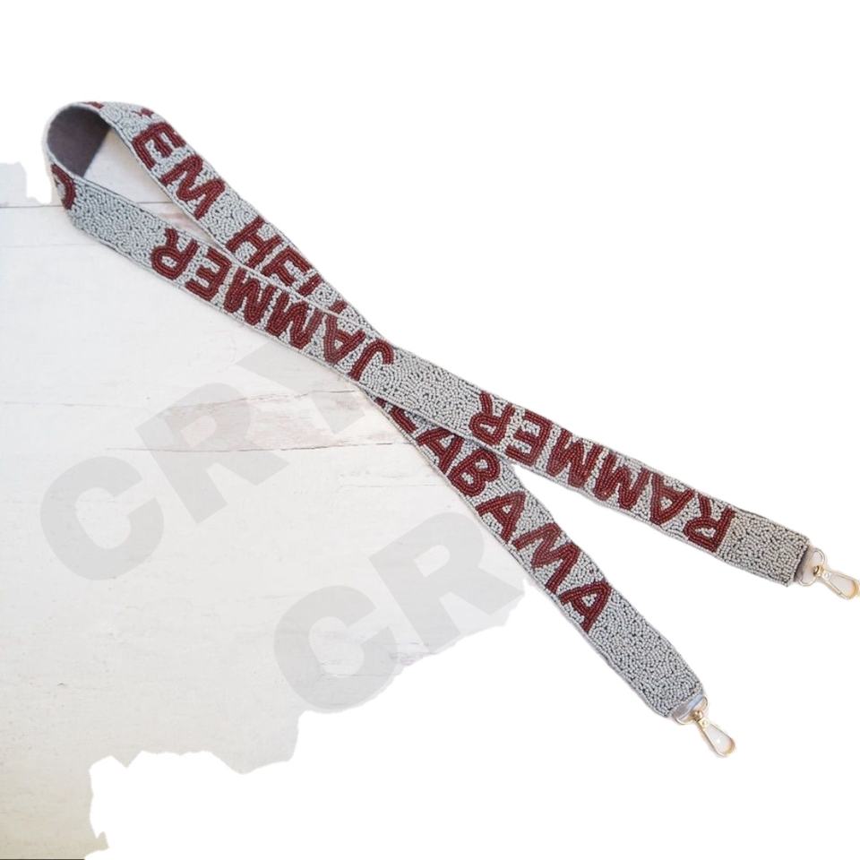 สายกระเป๋าถือประดับลูกปัดสีขาวทองแบบสั่งทำพิเศษ ยี่ห้อ CRYSTAL CRAFT รุ่น Rammer Jammer ปักลายด้วยมือ พร้อมห่วงคล้อง 'Hook Em Horns' ดีไซน์ทันสมัย