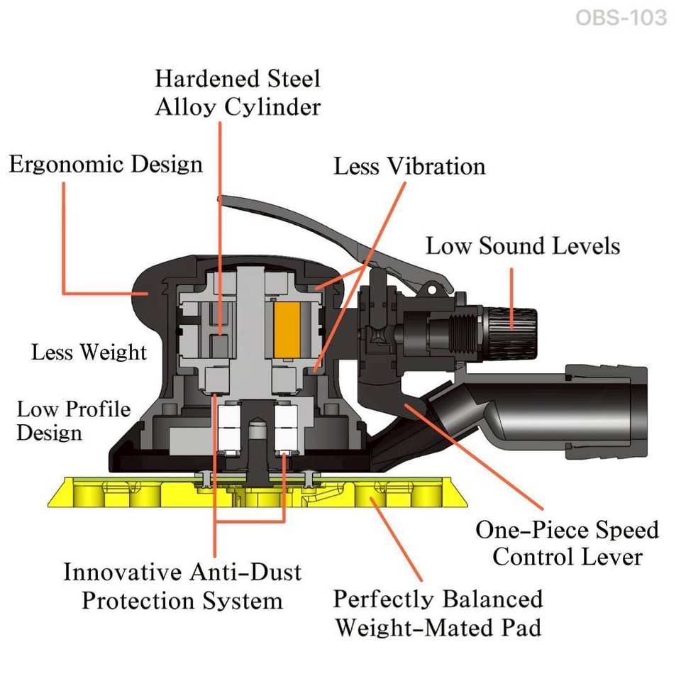 เครื่องขัดกระดาษทรายแบบวงโคจรสุ่ม 12,000 รอบต่อนาที ระบบดูดฝุ่นกลาง 5 มม. และ 3/16 นิ้ว (5) 6 แผ่น พร้อมมอเตอร์โรตารี่เวน สำหรับขัดรถยนต์ รุ่น OBS-103A-C6