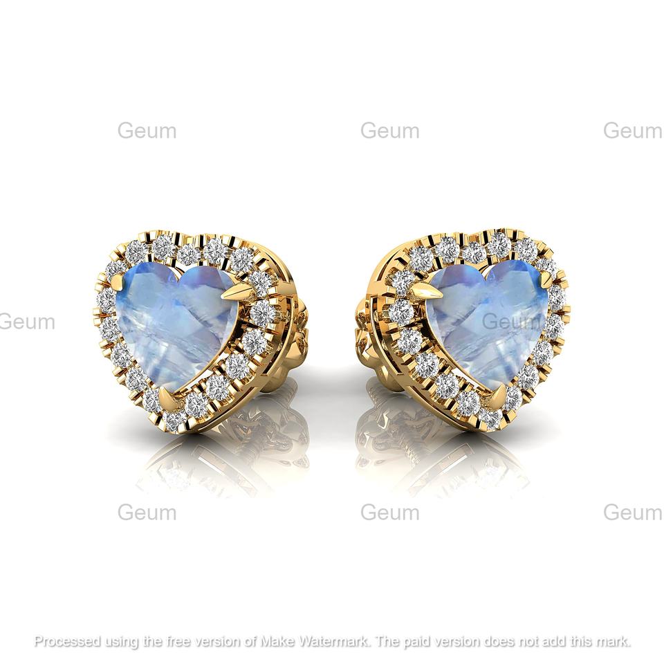 ต่างหูเม็ดเดี่ยวทรงพระจันทร์สีรุ้งที่หายากและเพชรแท้18K ทำด้วยมือสีโรสโกลด์ต่างหูรูปหัวใจโรแมนติก