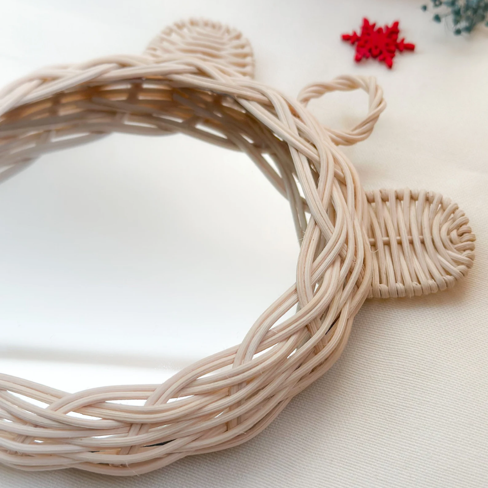 กระจกตกแต่งรูปหมีหวาย งานหวายธรรมชาติ งานฝีมือถักทอ ตกแต่งผนังสำหรับเด็ก
