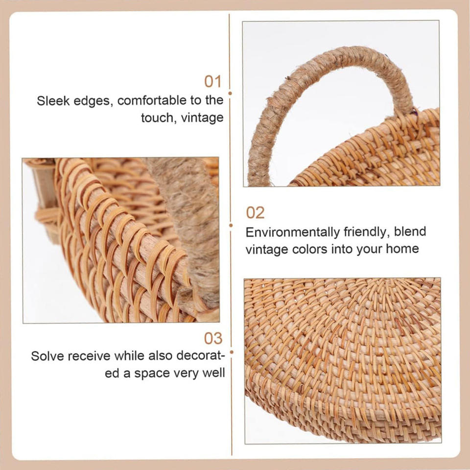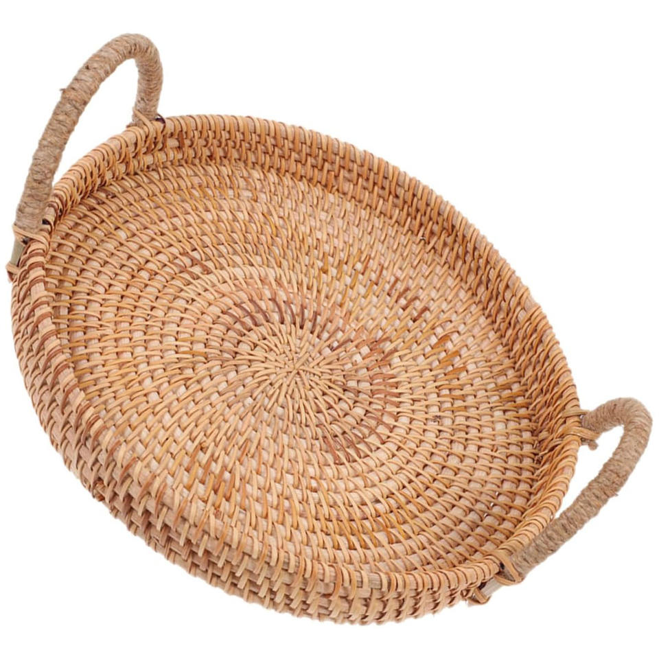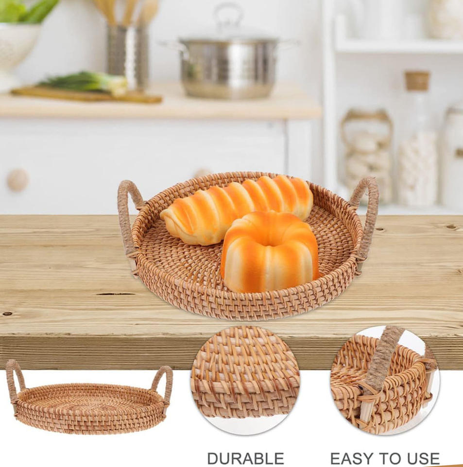 ถาดเสิร์ฟไม้หวายสำหรับกาแฟ ขนมปัง ผลไม้ ถาดหวาย ชั้นวางเครื่องเทศ ทำด้วยมือ ถาดอาหารเช้าทรงกลม ถาดตกแต่ง