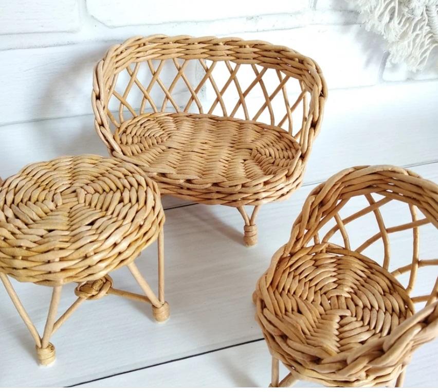 ชุดกาแฟหวายสไตล์โบฮีเมียนสำหรับบ้านตุ๊กตาของเล่นขนาดเล็กสไตล์ไม้ไผ่นุ่ม