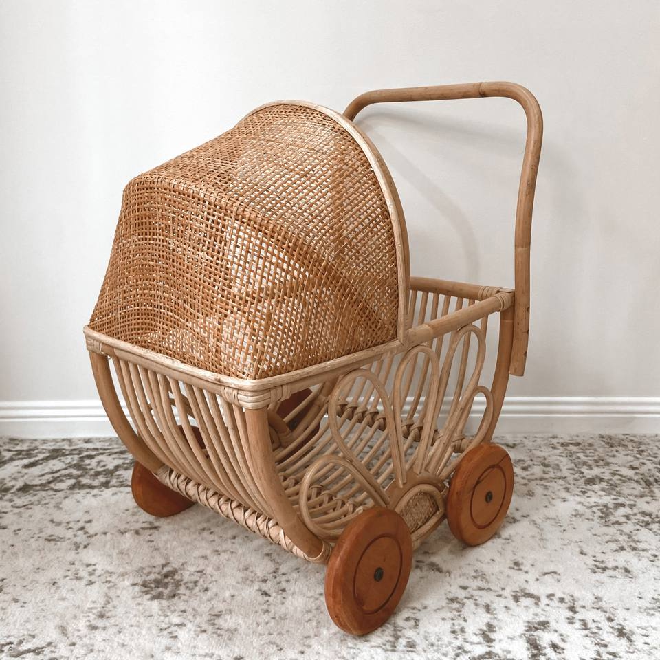 หวายตุ๊กตารถเข็นเด็กของเล่นแฮนด์เมดธรรมชาติหวายตุ๊กตาอุปกรณ์เสริมที่มีโลโก้ที่กำหนดเองขายส่ง