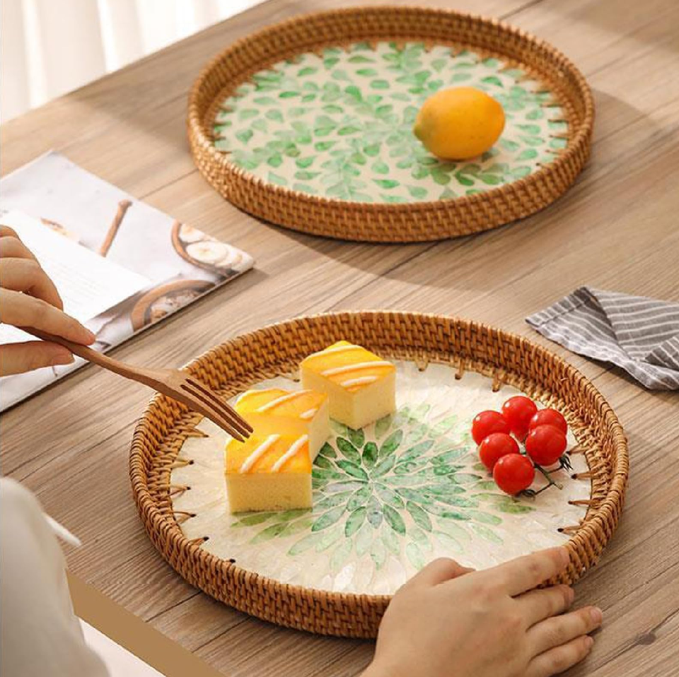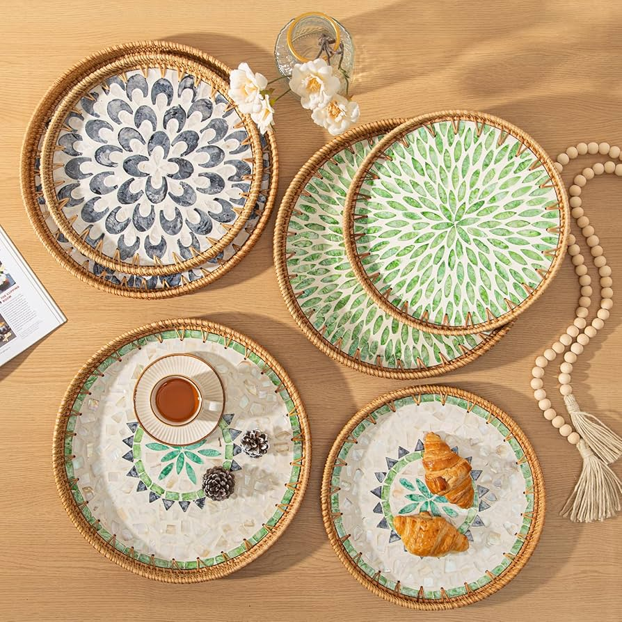 ถาดหวายและแม่ของไข่มุกงานฝีมือจากหวายและไม้ถูพื้นดีไซน์เนอร์ที่แตกต่างกันถาดขนาดต่างๆ