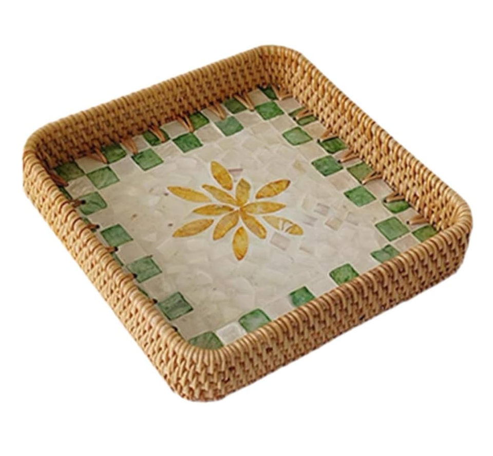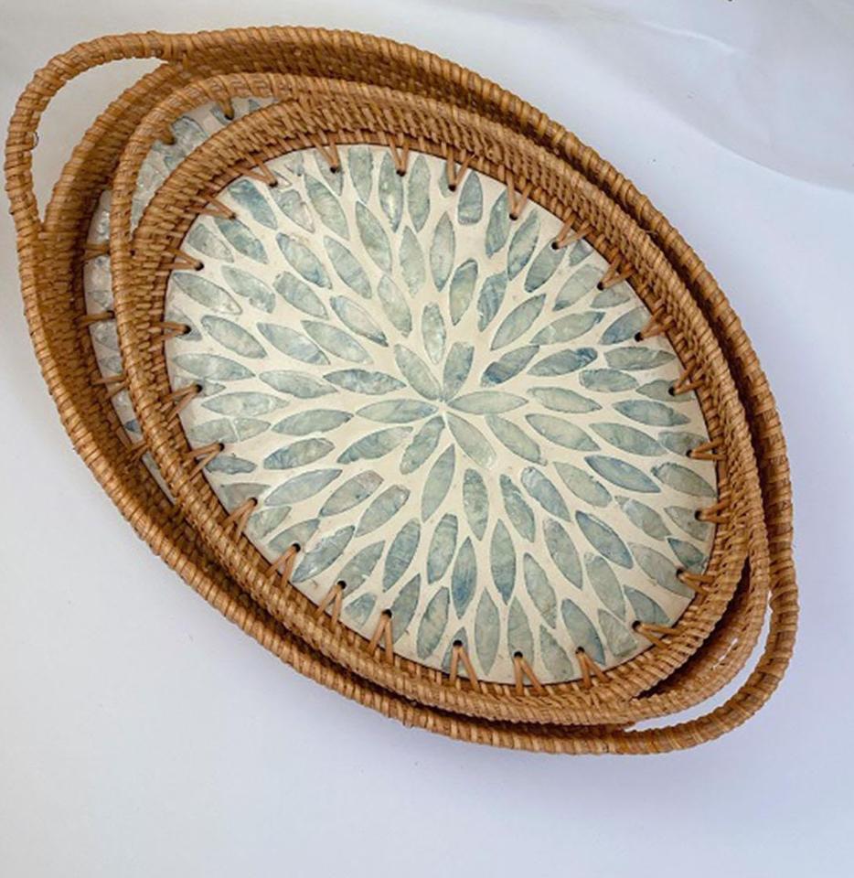 ถาดหวายลายมุก ถาดเก็บของ ขายส่ง ปรับแต่งได้ 4 ชิ้น ถาดเสิร์ฟหวายและมุกทรงกลม