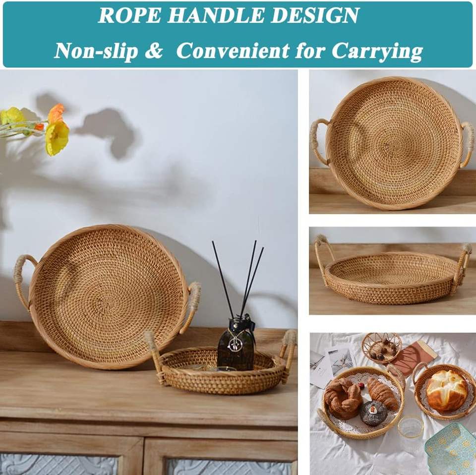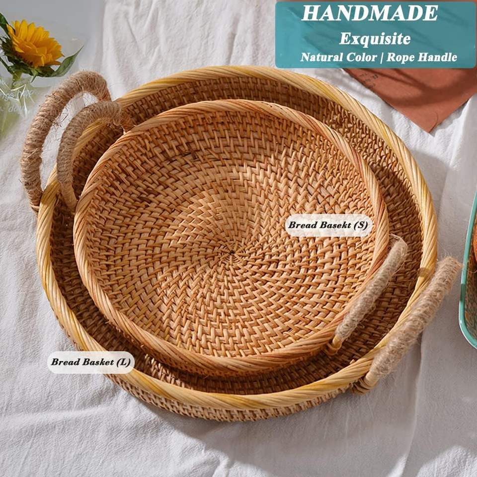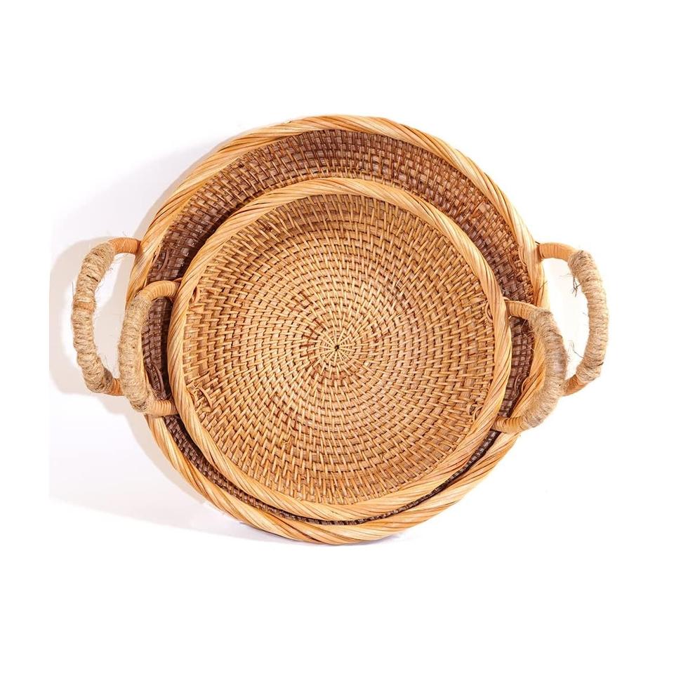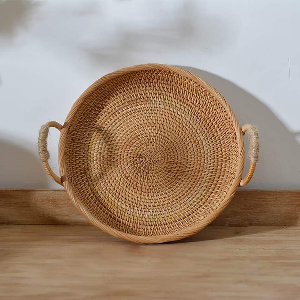 ถาดเสิร์ฟทรงกลมหวายพร้อมหูจับ ถาดชาและกาแฟหวายธรรมชาติสานด้วยมือ สำหรับใช้ในบ้านและร้านกาแฟ
