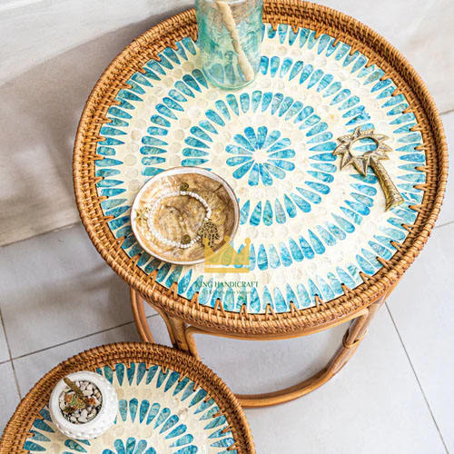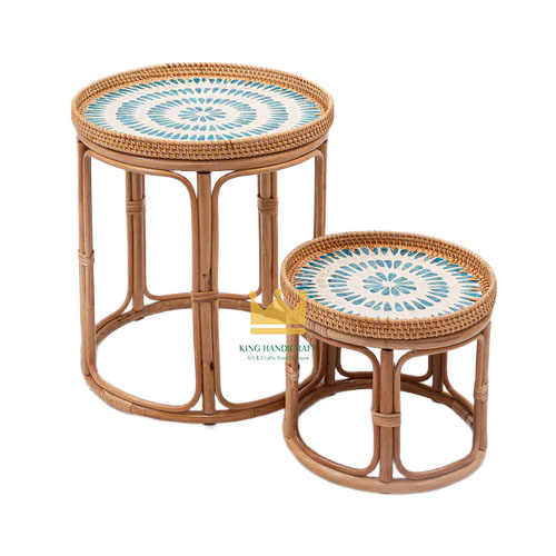 โต๊ะข้างหวาย หน้าปัดฝังมุก โต๊ะกาแฟหวายทรงกลม ปรับขนาดได้ เฟอร์นิเจอร์ห้องนั่งเล่น