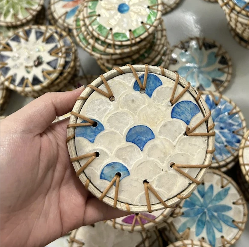 แผ่นรองแก้วหวายฝังมุก งานแฮนด์เมด สำหรับตกแต่งโต๊ะอาหาร จากเวียดนาม