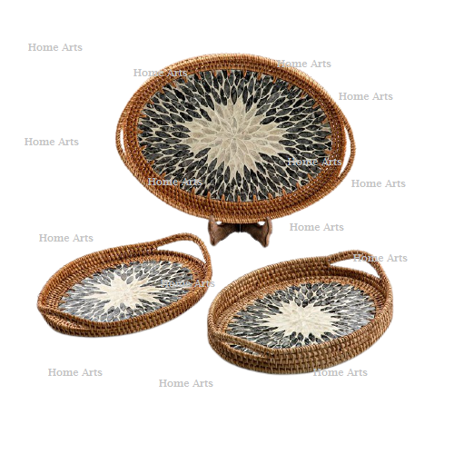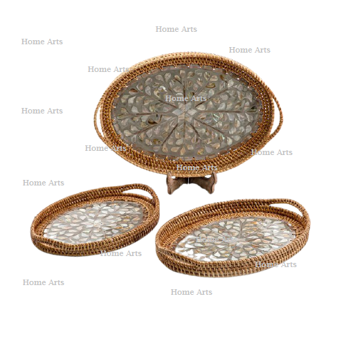 ถาดเสิร์ฟชา กาแฟ หวาย ประดับมุก ชุด 3 ขนาดต่างกัน ถาดเสิร์ฟขนมหวาน ขาย