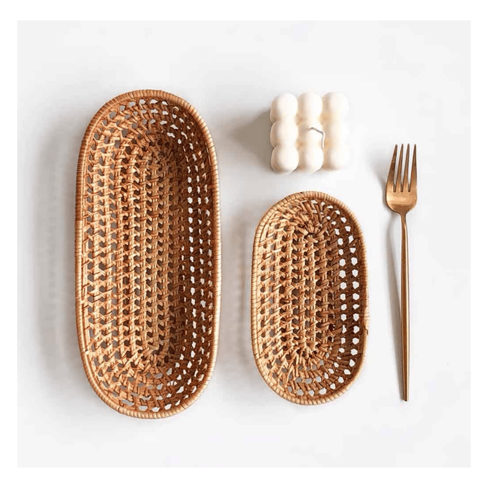 ตะกร้าและถาดสานหวาย ทำด้วยมือจากเส้นใยหวายธรรมชาติ สำหรับเสิร์ฟอาหาร เก็บของ และตกแต่งบ้าน ผลิตในเวียดนาม