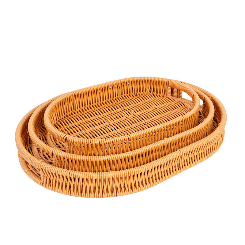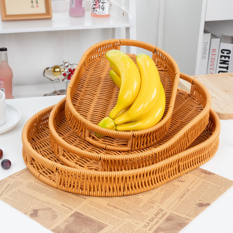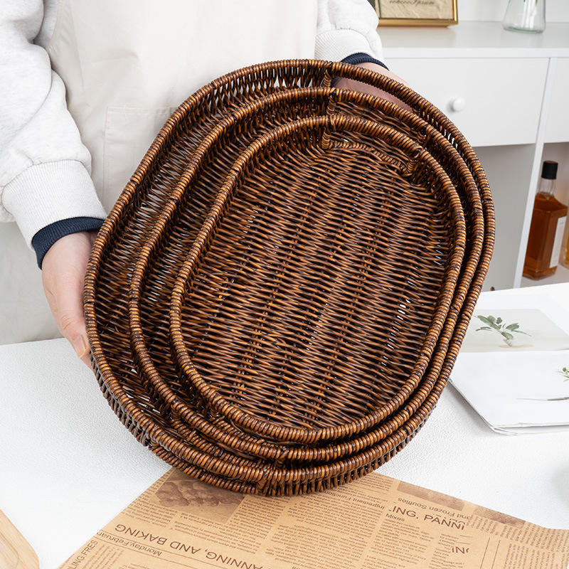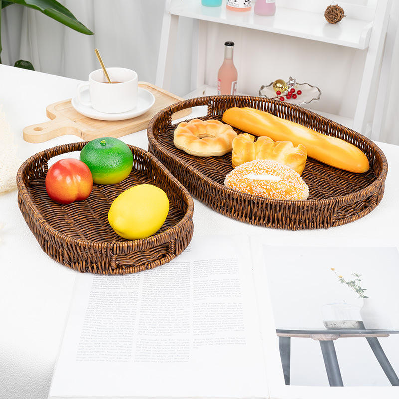 ชุดถาดเสิร์ฟหวายสานรูปวงรี ตะกร้าเก็บของทำมือ สำหรับใส่ขนม ผลไม้ ขนมอบ ขนมปัง ใช้สำหรับจัดแสดงในครัว ห้องรับประทานอาหาร