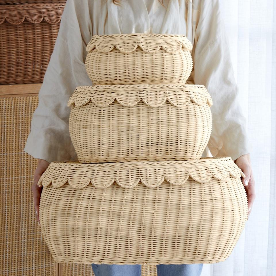 กล่องหวายสำหรับใส่ผ้าและของใช้จำเป็นในบ้าน พร้อมฝาปิดแบบสแกลลอป ตะกร้าใส่ของในห้องนอน