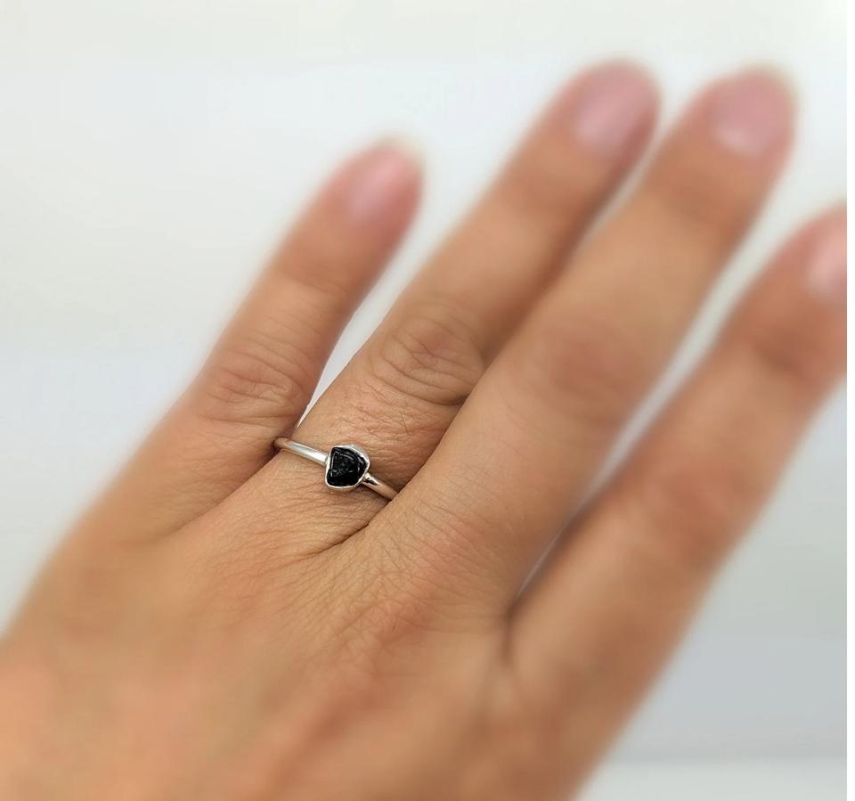 แหวนเงินแท้ 925 ชุบทอง ประดับคริสตัลสีดำดิบ ดีไซน์เรียบหรู ทันสมัย สามารถสวมซ้อนกันได้ เหมาะสำหรับงานปาร์ตี้ ประดับพลอยเดี่ยวแบบหยาบ