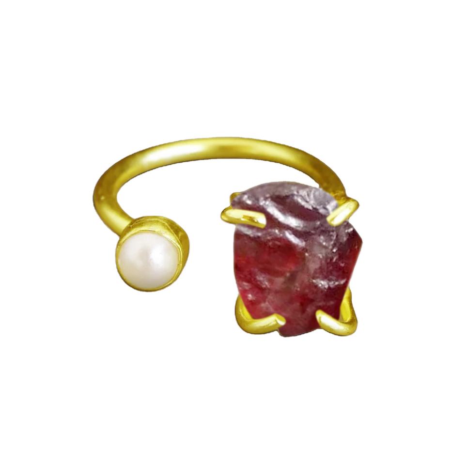 แหวนพลอยโกเมนดิบประดับมุก – แหวนเงินแท้ 925 ปรับขนาดได้สำหรับผู้หญิง
