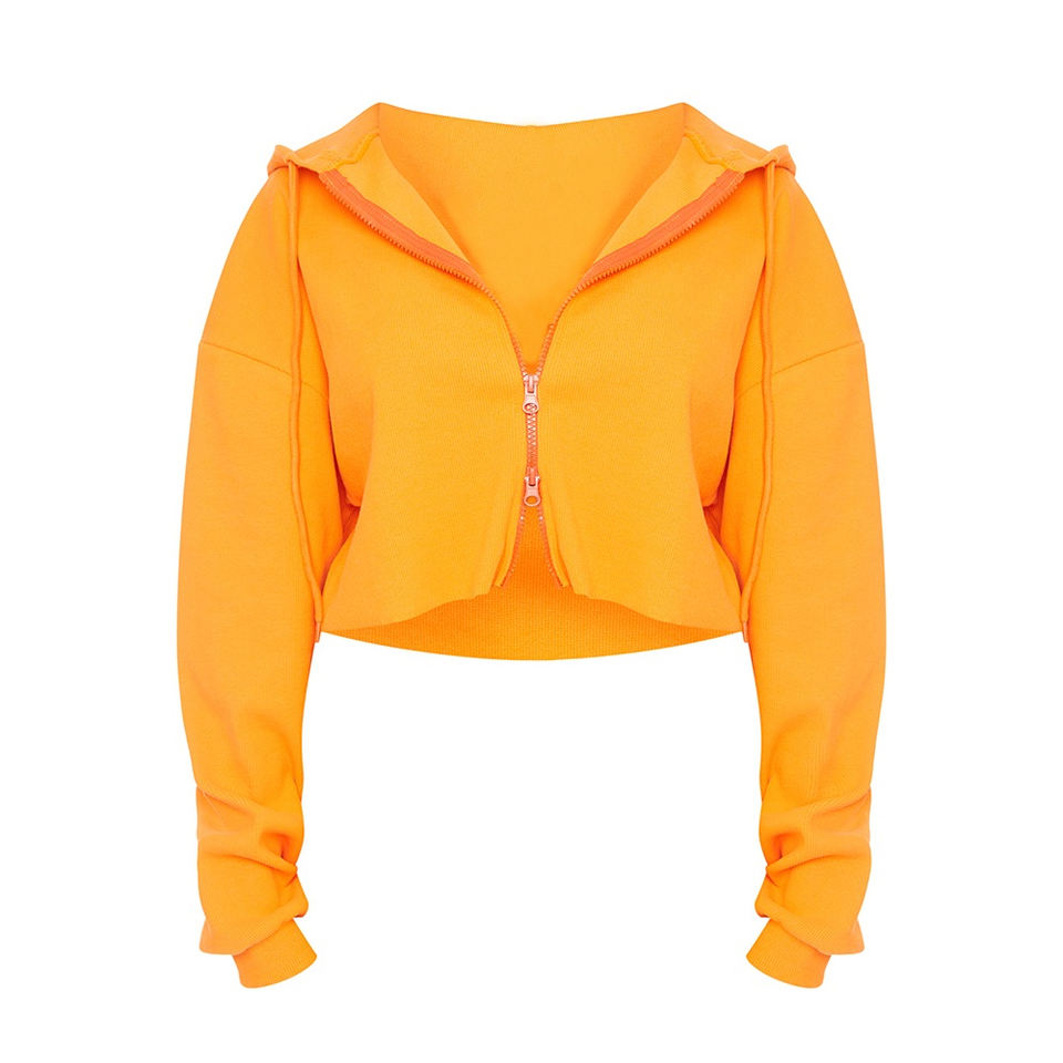 ดิบเฮ็มตัดซิปผ่านเสื้อกันหนาวหมวกสําหรับผู้หญิง Zip-Up ตัดเสื้อกันหนาวหมวกสีส้มปักพืชเสื้อกันหนาวหมวกฤดูใบไม้ร่วงฤดูหนาวด้านบน