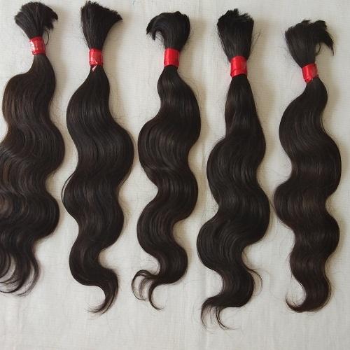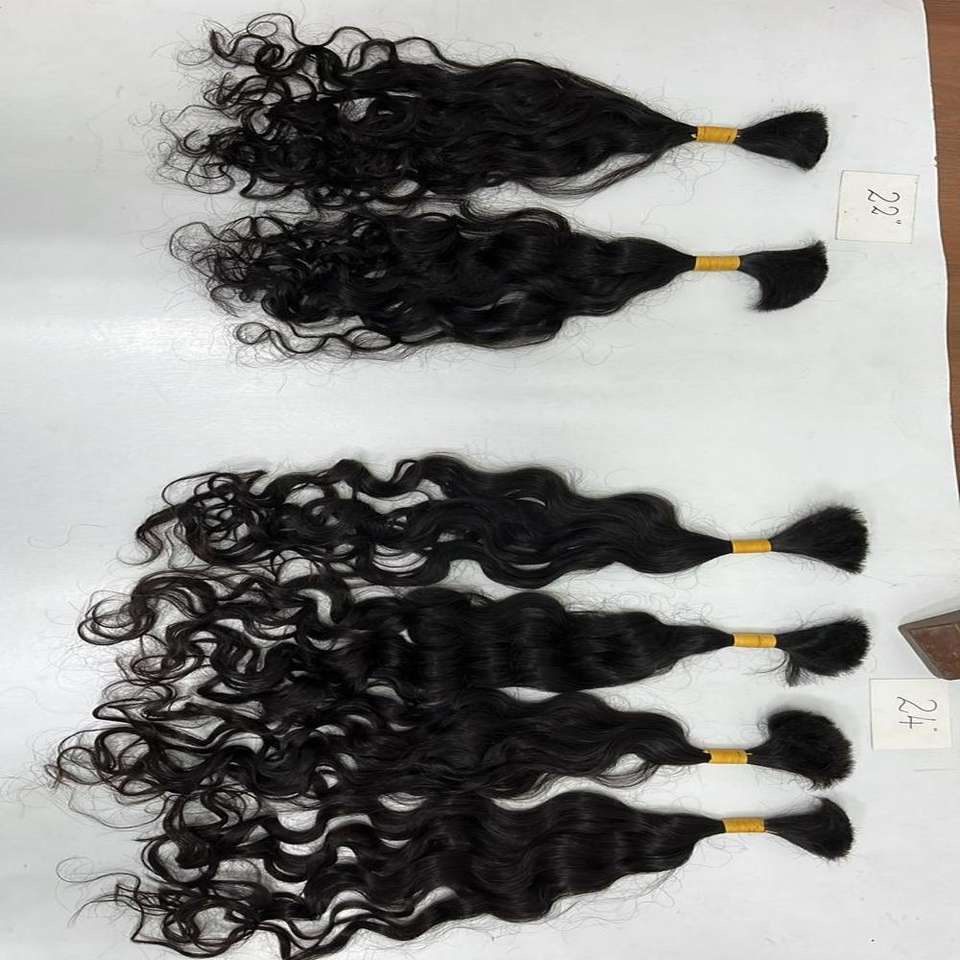 ผมแท้จากวัดในอินเดียแบบเป็นมัด ตัดจากผู้บริจาคคนเดียว แบบลอนธรรมชาติ ยังไม่ผ่านการทำสี จัดเรียงเกล็ดผม สีดำธรรมชาติ สำหรับต่อผมและจัดแต่งทรง