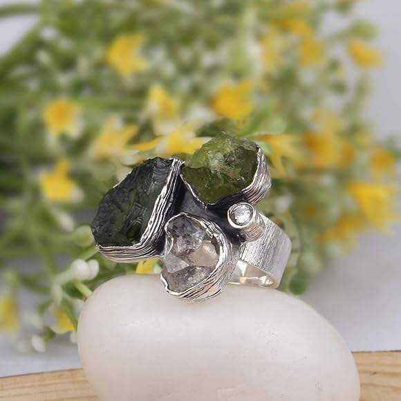 Raw Moldavite Herkimer Diamond Ring Sterling Silver Statement Stone Ring For Women