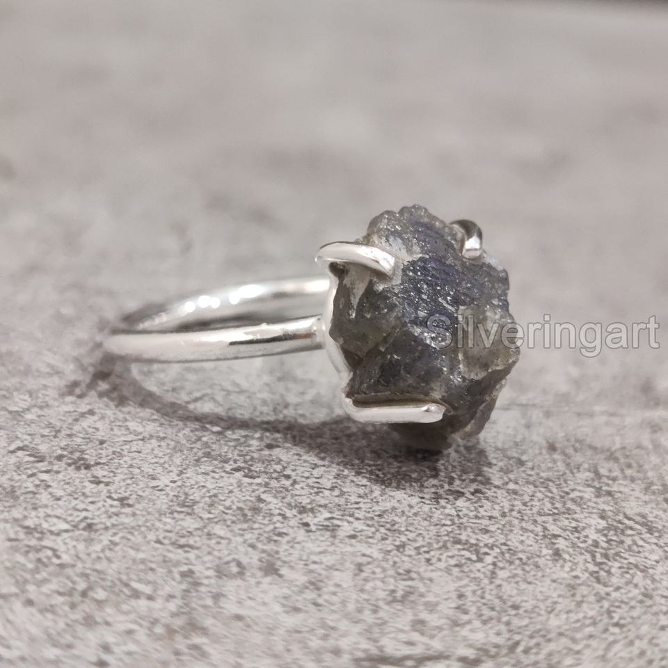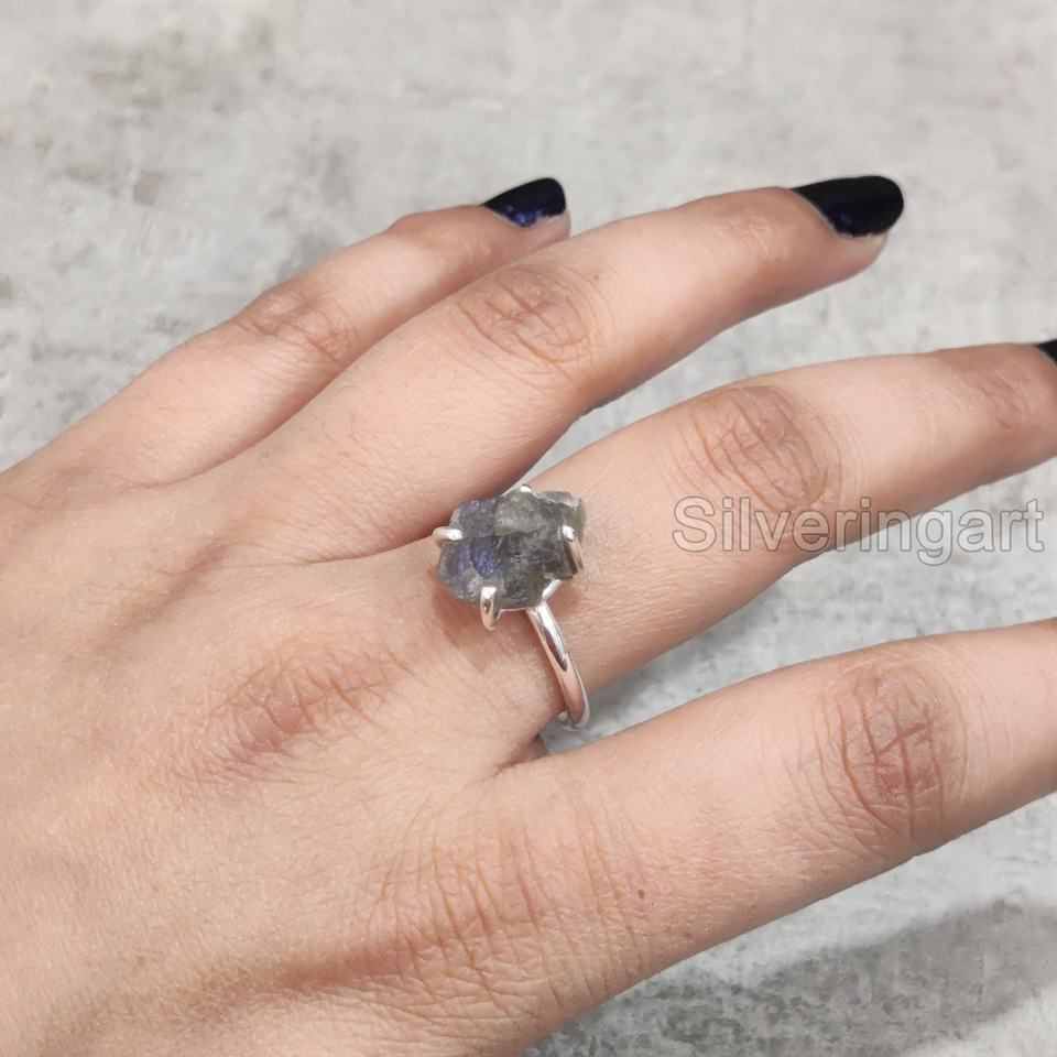 แหวนเงินแท้ 925 ประดับพลอยลาบราดอไรต์ดิบธรรมชาติ ปรับขนาดได้ สำหรับผู้หญิง ของขวัญคริสต์มาส