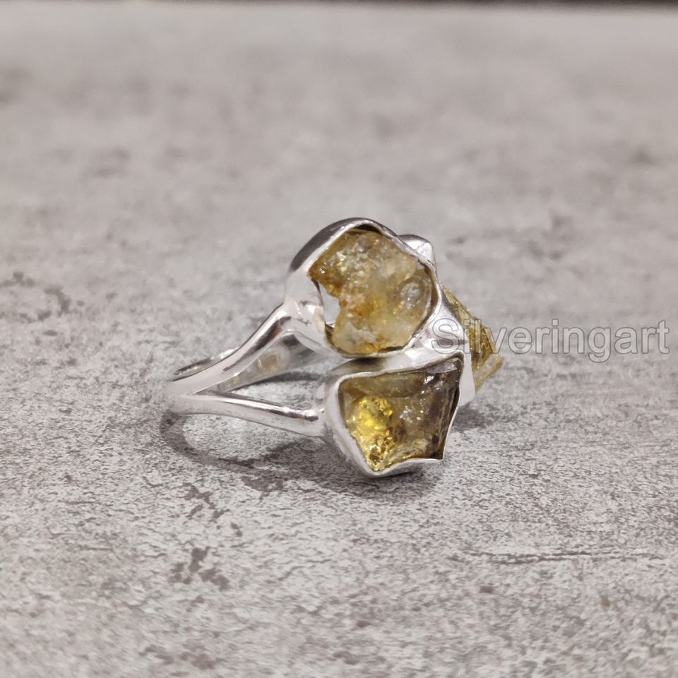 เครื่องประดับหินดิบแหวนผู้หญิงแหวนซิทรีนธรรมชาติพลอยหยาบ November พลอยสามชิ้นเครื่องประดับหิน925แหวนเงินสเตอร์ลิง