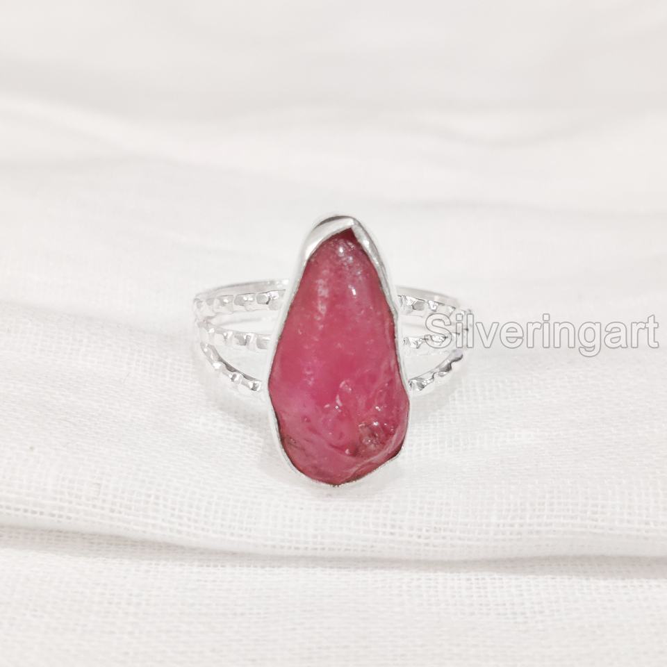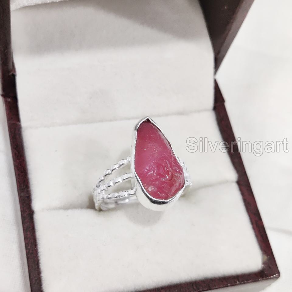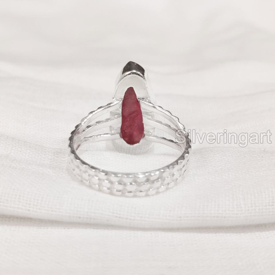 เครื่องประดับหินดิบแหวนผู้หญิงพลอยทับทิมธรรมชาติหยาบอัญมณีทำด้วยมือวงแหวนเงินสเตอร์ลิง925