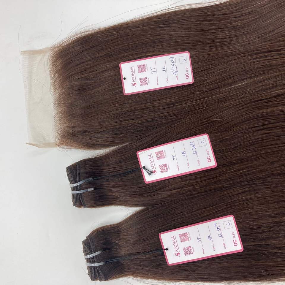 ผมต่อแบบตรงยาว12นิ้วผมต่อผมสีน้ำตาลเข้มสไตล์ลอนลึกแบบดิบเวียดนามเอชดี