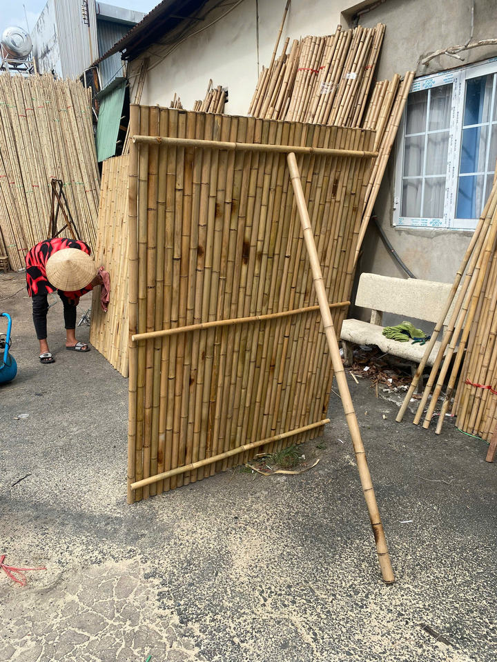 เสาไม้ไผ่ดิบวัสดุที่เป็นมิตรกับสิ่งแวดล้อมสำหรับระแนงไม้เรือนกระจกสำหรับทำฟาร์มและเกษตรกรรมจำนวนมากจากเวียดนามทนทานใช้งานได้