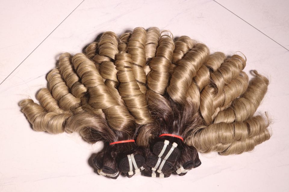 มัดผมดิบเด้งดุมผมสีบลอนด์อ่อนมีรากสีน้ำตาล100% ผมมนุษย์ (ผมดิบ) ผมหยิกเด้งคุณภาพสูง