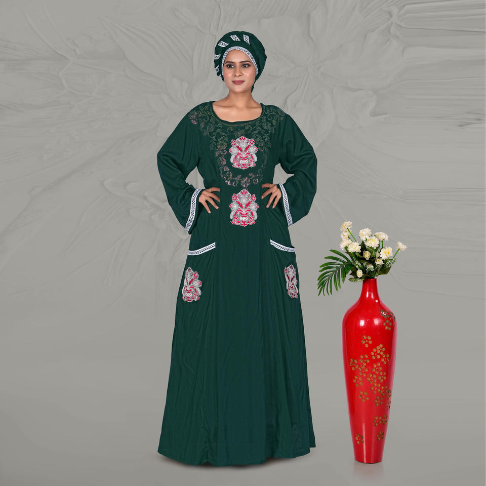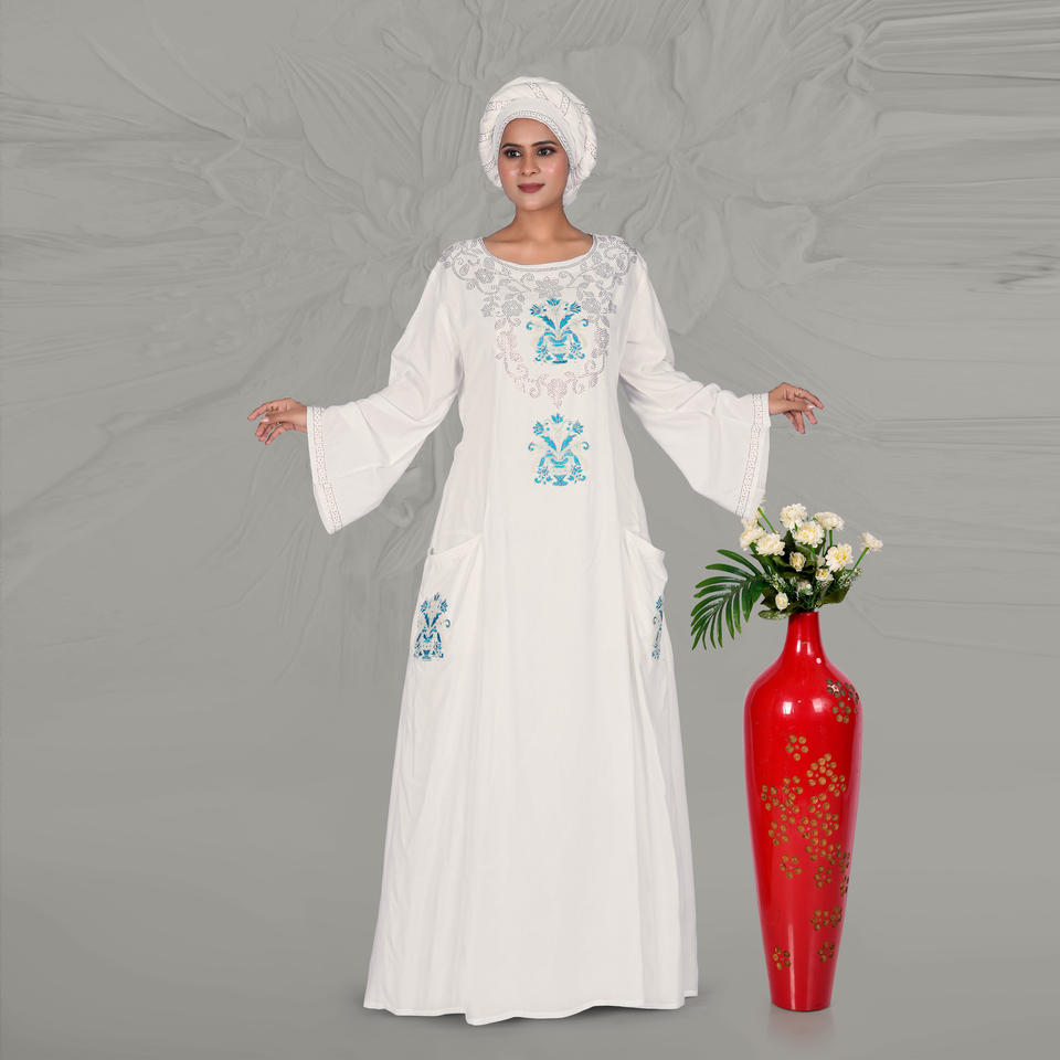 ชุดกะฟตันผ้าเรยอนปักลายประณีต ตกแต่งด้านหน้าด้วยลวดลายโดดเด่น แขนบาน มีกระเป๋าข้าง เหมาะสำหรับงานปาร์ตี้ อีด และรอมฎอน