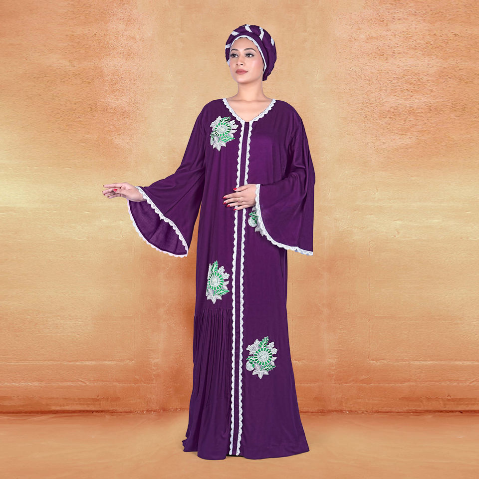 ชุดคาฟตันผ้าเรยอนปักลาย แต่งลูกไม้ด้านหน้า แขนบาน น้ำหนักเบา ระบายอากาศได้ดี เนื้อผ้านุ่ม จับจีบ ยาวคลุมเท้า