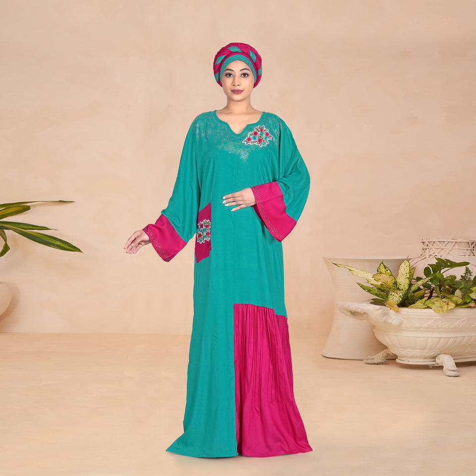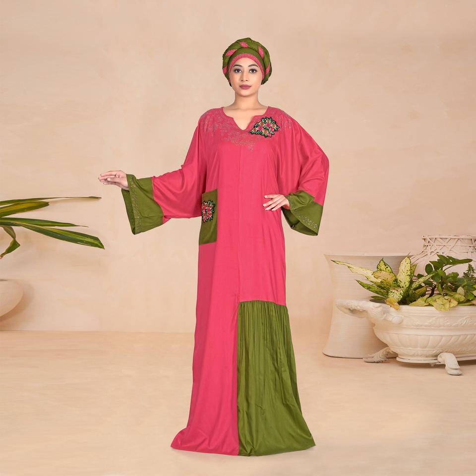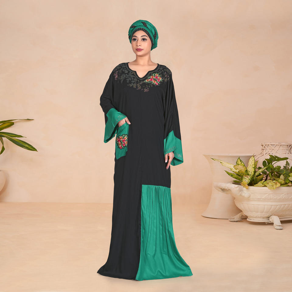 ชุดคาฟตันผ้าเรยอนปักลายดอกไม้ แต่งผ้าตัดต่อช่วงคอเสื้อ แขนกว้าง ไซส์พลัส ทรงสวยสง่า ยาวคลุมเท้า